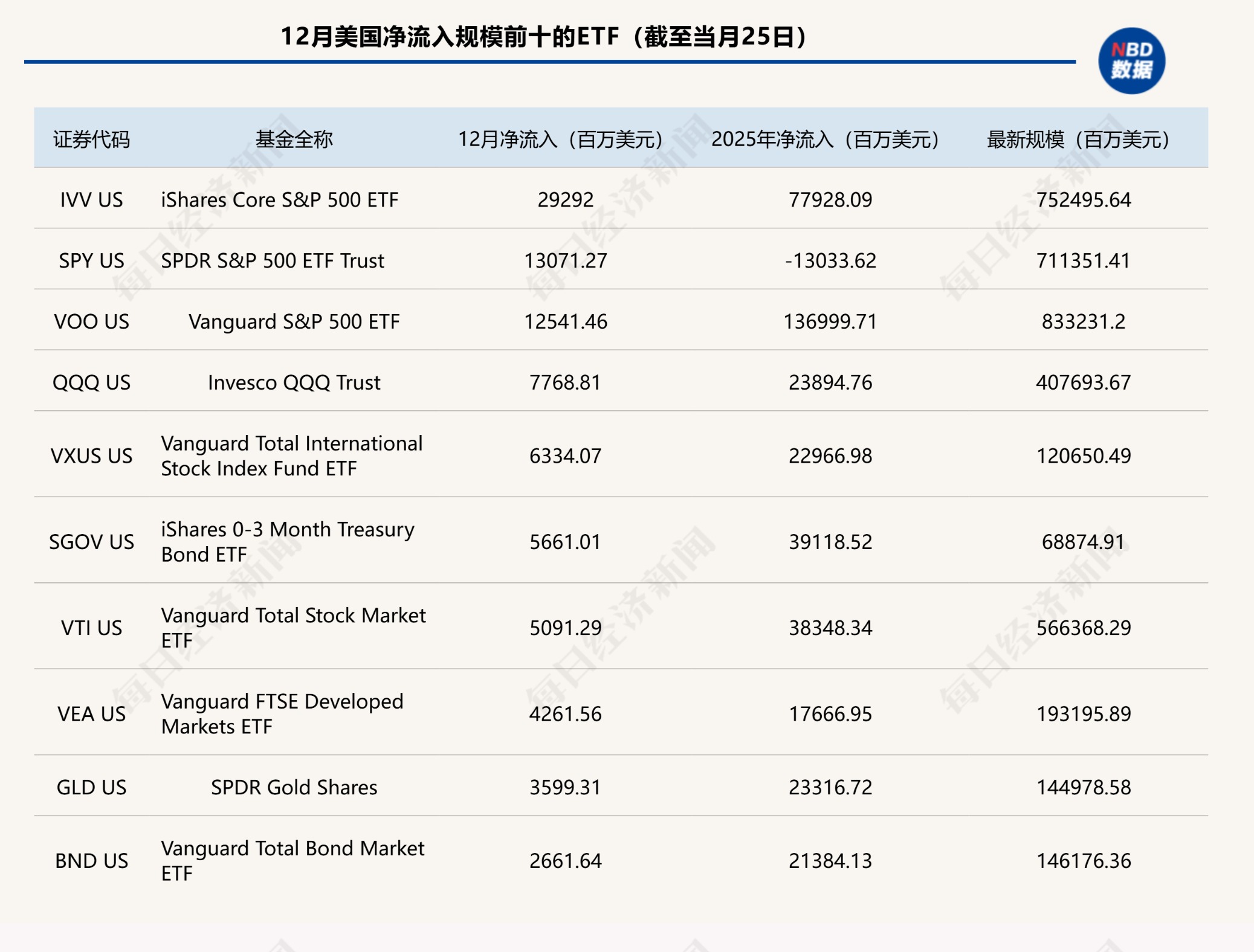 固定收益型ETF也需求旺盛,12月凈流入509.5億美元,全年累計(jì)凈流入4586.3億美元,顯著高于2024年的3152.4億美元。