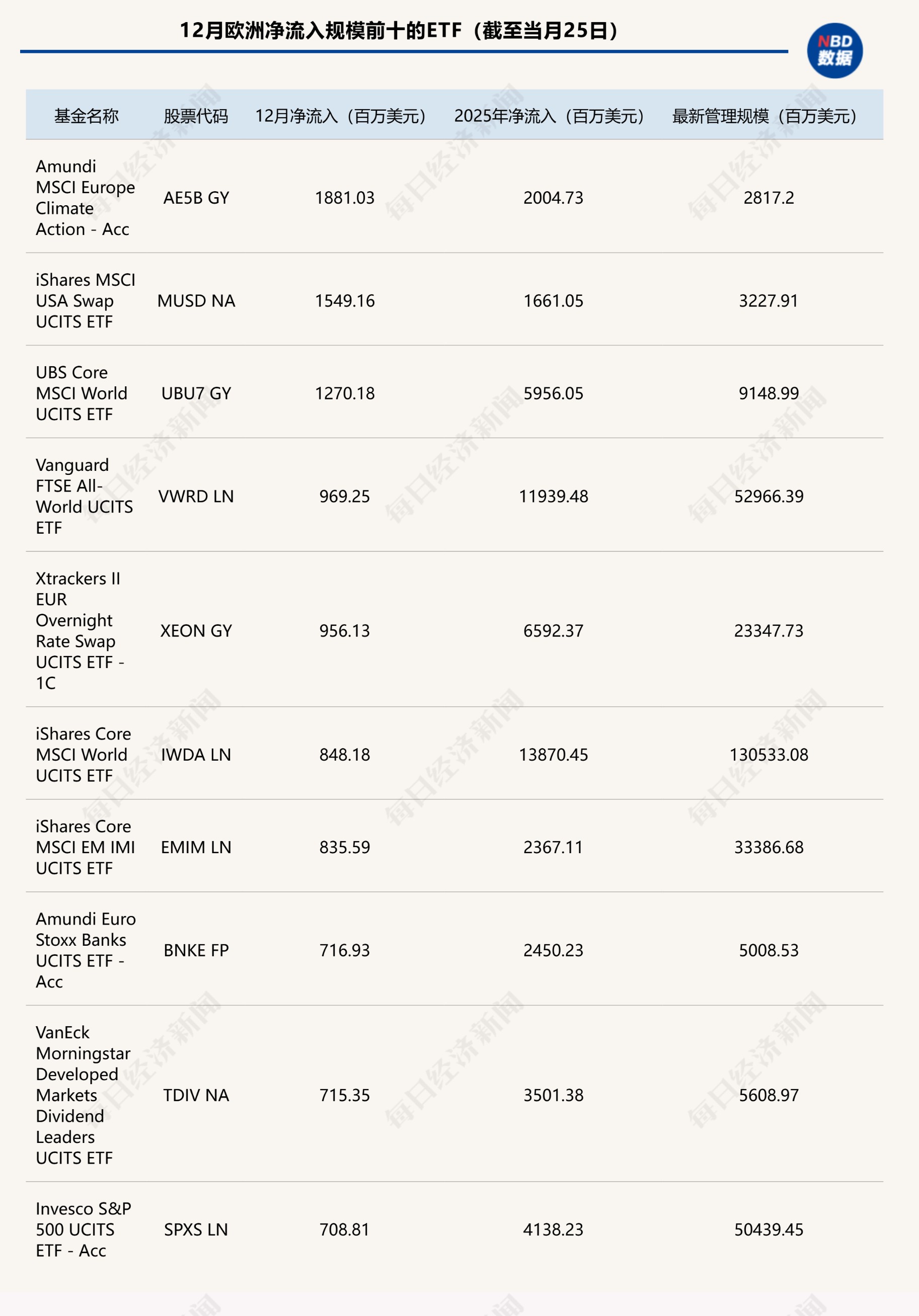 ETFGI數(shù)據(jù)還顯示,12月凈流入金額最多的ETF是Amundi MSCI Europe Climate Action-Acc,新增18.8億美元。前20只凈增資產(chǎn)最多的ETF在12月共吸引了160.1億美元的資金流入。