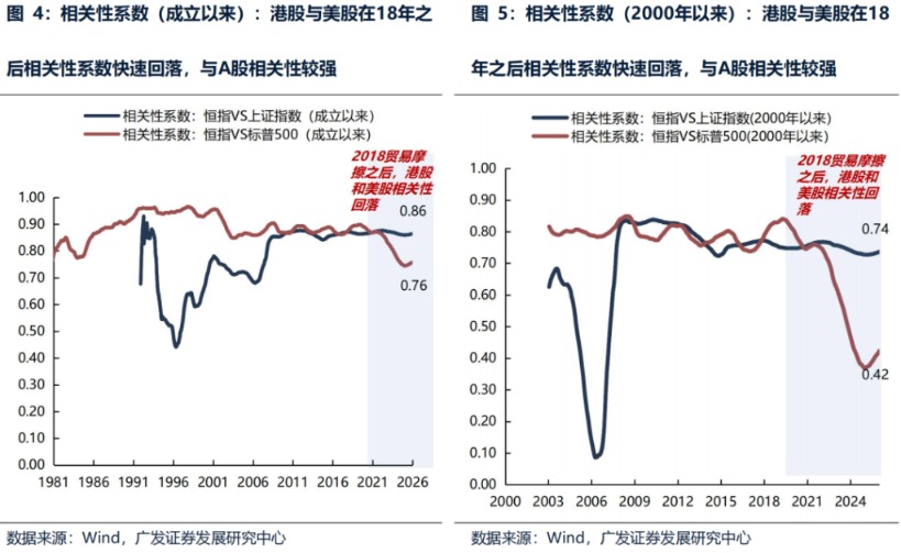 恒生指數(shù)在春節(jié)前3個(gè)交易日上漲概率82%,節(jié)后并沒(méi)有明顯的日歷效應(yīng),上漲概率僅在40%~60%,春節(jié)后-兩會(huì)的典型窗口并不天然適配港股。但這次也可能不一樣,港股近年來(lái)的定價(jià)邏輯正在發(fā)生變化,港股與A股的相關(guān)性走強(qiáng),與美股的相關(guān)性走弱,港股存在一定的“被動(dòng)跟隨”上漲的可能性,例如24、25年的春節(jié)后。