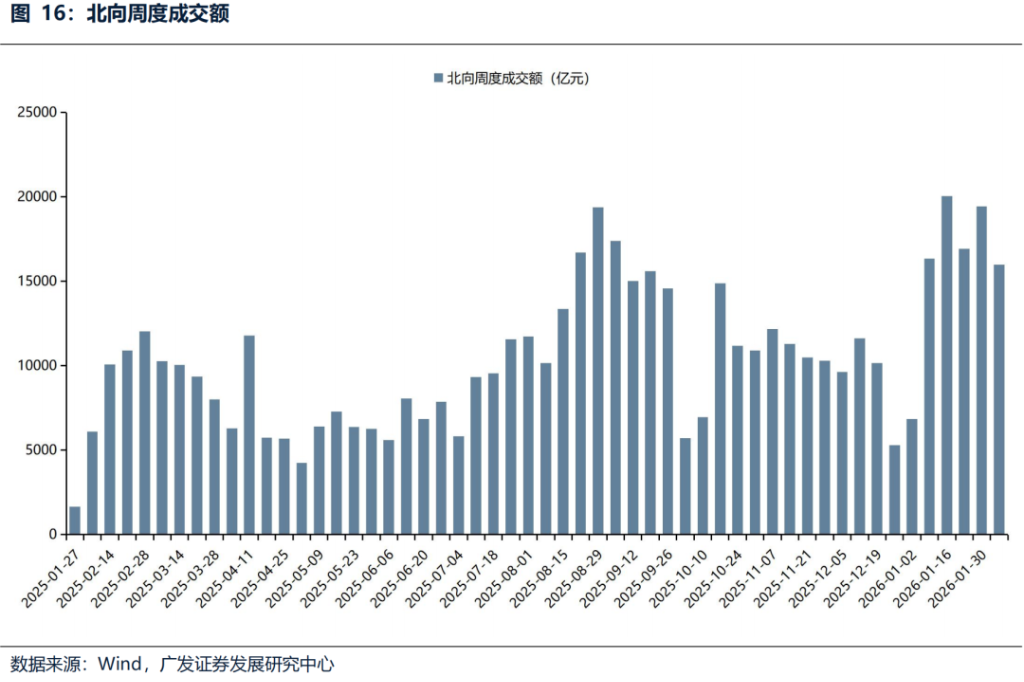 北向資金本周日均成交額收斂。本周(2月2日—2月6日)北向資金總成交金額為1.60萬(wàn)億元,日均成交額為3999.01億元,較上周日均成交金額減少864.86億元。