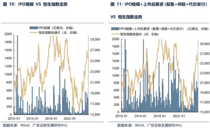 IPO規(guī)模高峰、募資高峰(算入上市后募資,即配售+供股+代價(jià)發(fā)行)并不會(huì)扭轉(zhuǎn)港股的趨勢(shì)。典型的例如2010年、2014-2015年、2017年、2020年、2025年港股的募資高峰都未影響港股的牛市,背后可能是由于港股市場(chǎng)出現(xiàn)明顯好轉(zhuǎn),部分企業(yè)有擴(kuò)張需求,選擇相對(duì)高點(diǎn)在資本市場(chǎng)募資。