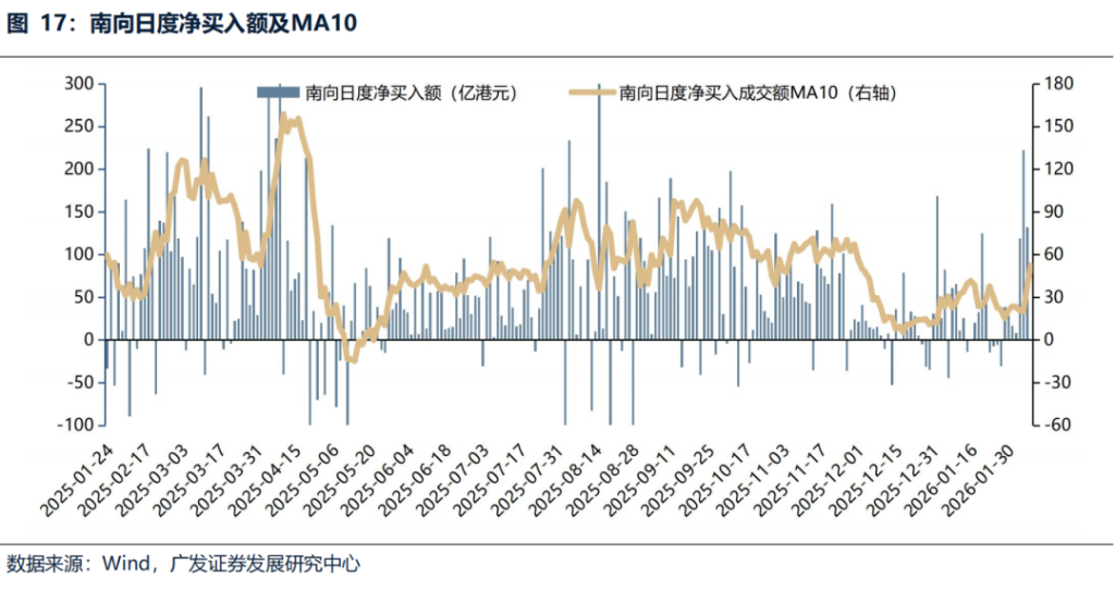?。?)內(nèi)外資配置需求仍在:南向資金定價(jià)權(quán)已穩(wěn)步提升至20%-30%,近期港股主題基金密集上報(bào)顯示中長(zhǎng)期配置意愿依然強(qiáng)勁;外資在年初積極布局中國(guó)核心資產(chǎn),若市場(chǎng)情緒回暖,外資回流可能性較高。