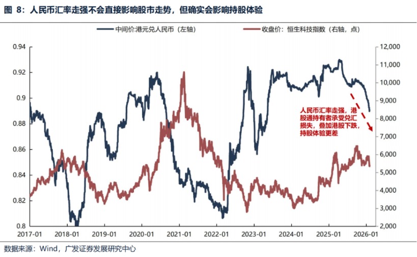 (二)近期人民幣匯率走強(qiáng),雖不會(huì)影響港股走勢(shì),但匯兌損失影響下,確實(shí)導(dǎo)致持股體驗(yàn)更差