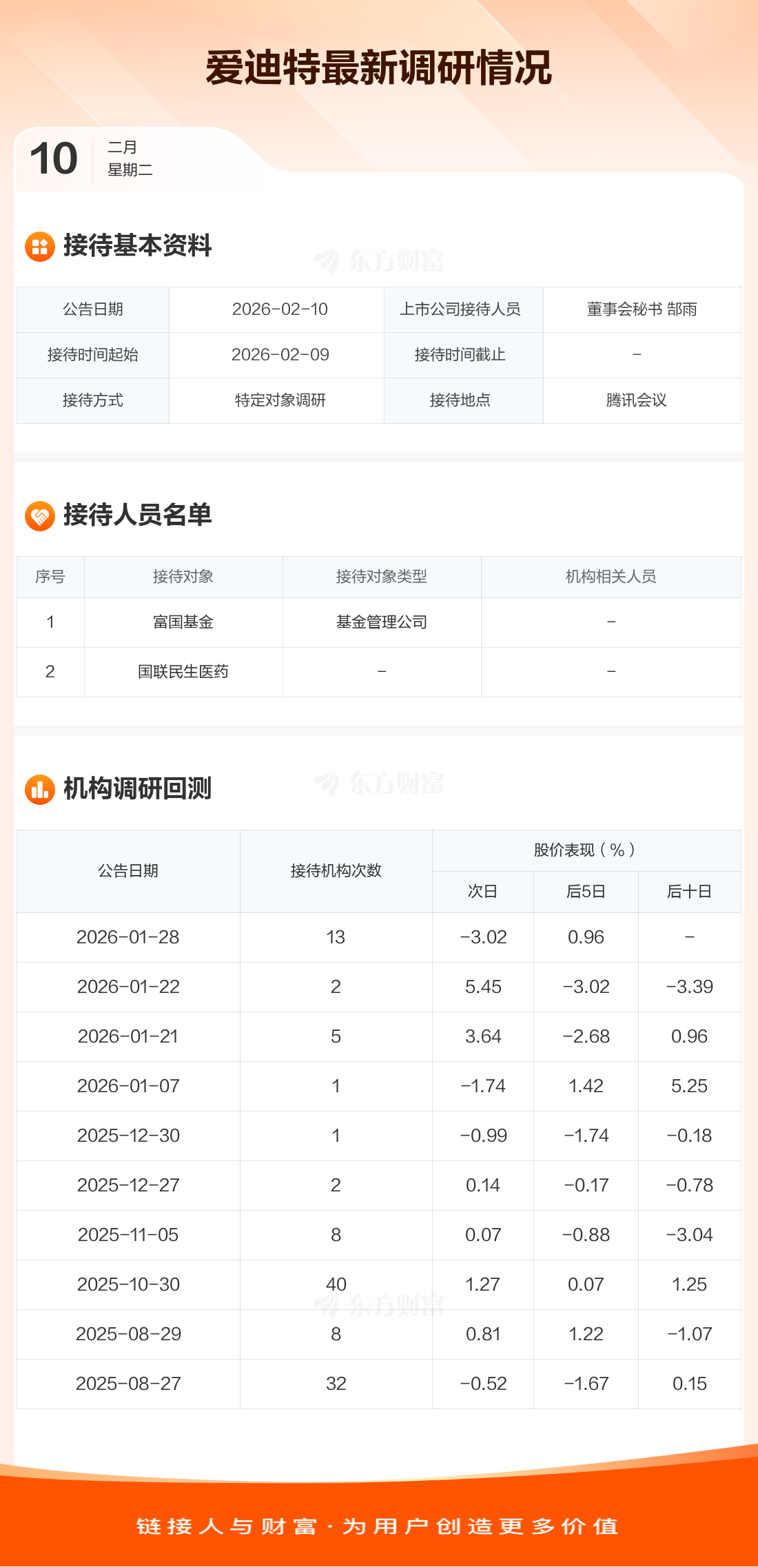 愛迪特2月10日公告稱,2月9日接待富國基金等2家機構(gòu)調(diào)研。接待人員包括董事會秘書 郜雨。