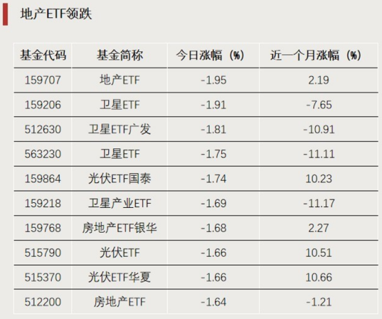 今天,地產(chǎn)、衛(wèi)星、光伏相關(guān)ETF跌幅居前。