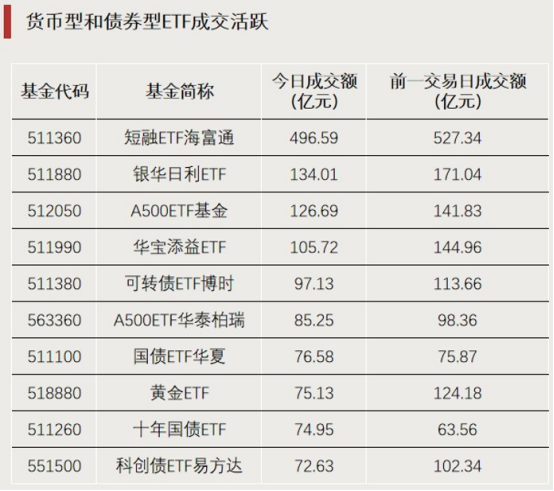 今日,成交額位列前十的ETF中,多數(shù)是貨幣型和債券型ETF,僅有兩只股票型ETF,均為A500ETF產(chǎn)品。