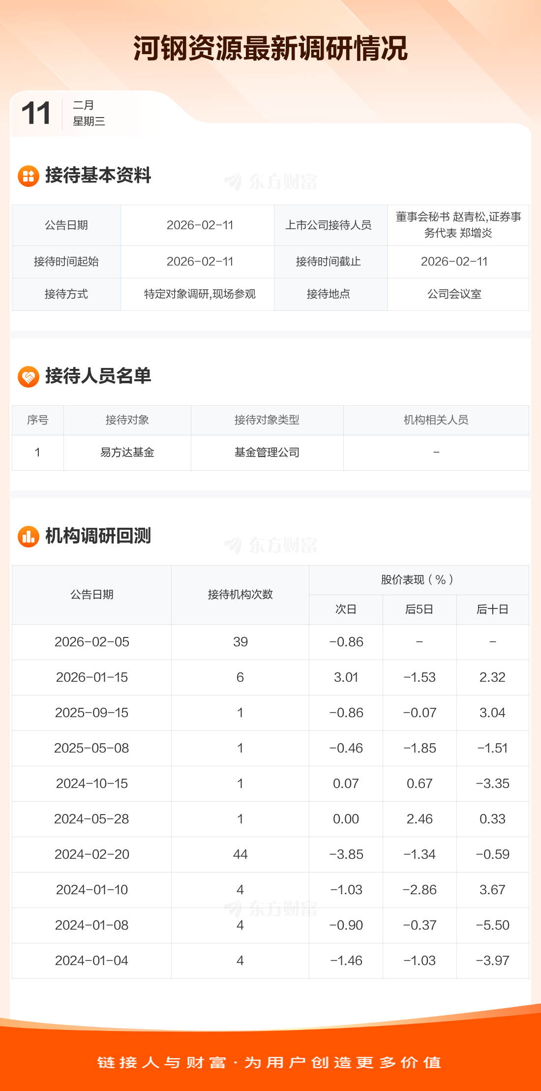 河鋼資源2月11日公告稱,2月11日接待易方達(dá)基金等1家機(jī)構(gòu)調(diào)研。接待人員包括董事會(huì)秘書 趙青松,證券事務(wù)代表 鄭增炎。