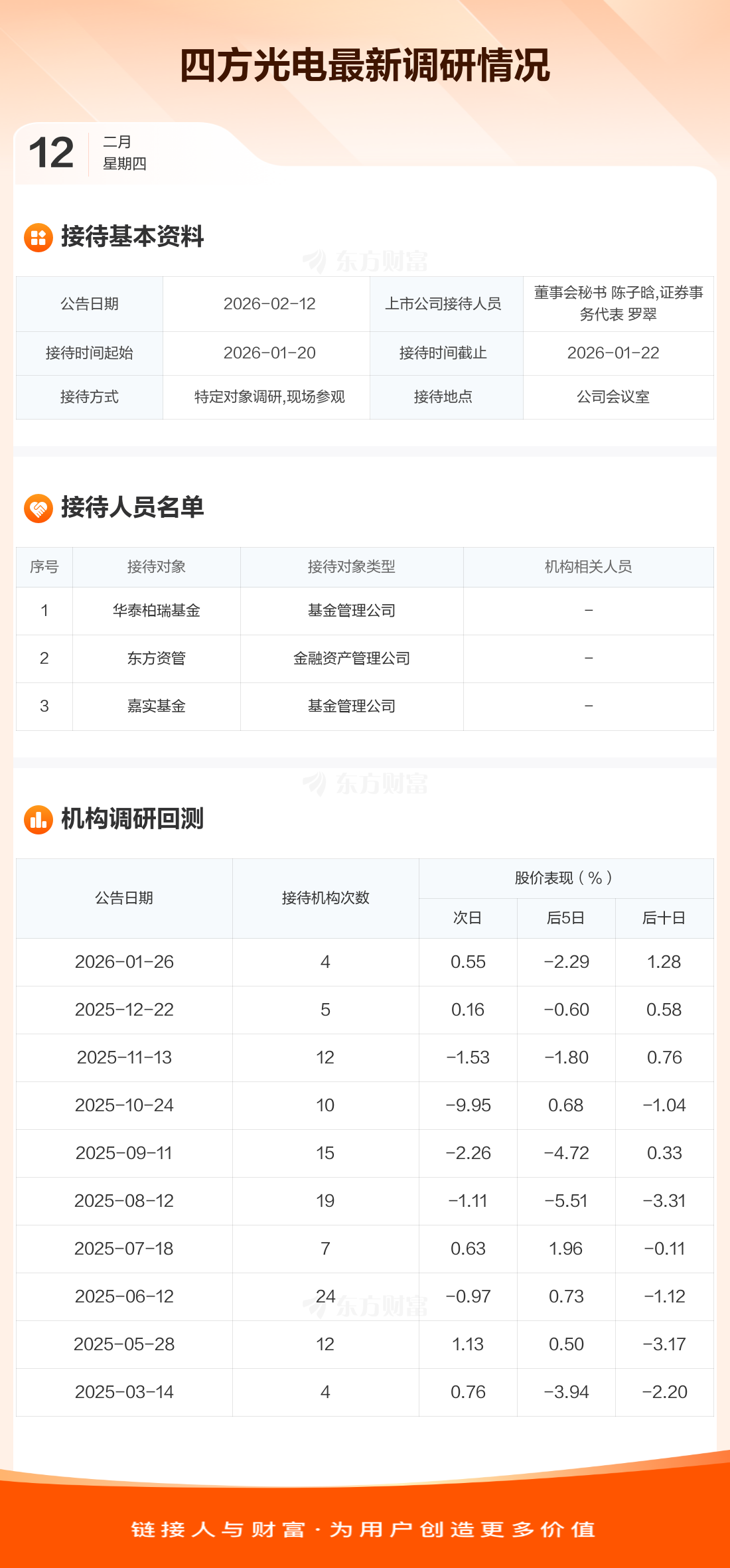四方光電2月12日公告稱,1月20日至1月22日接待華泰柏瑞基金等3家機構(gòu)調(diào)研。接待人員包括董事會秘書 陳子晗,證券事務(wù)代表 羅翠。