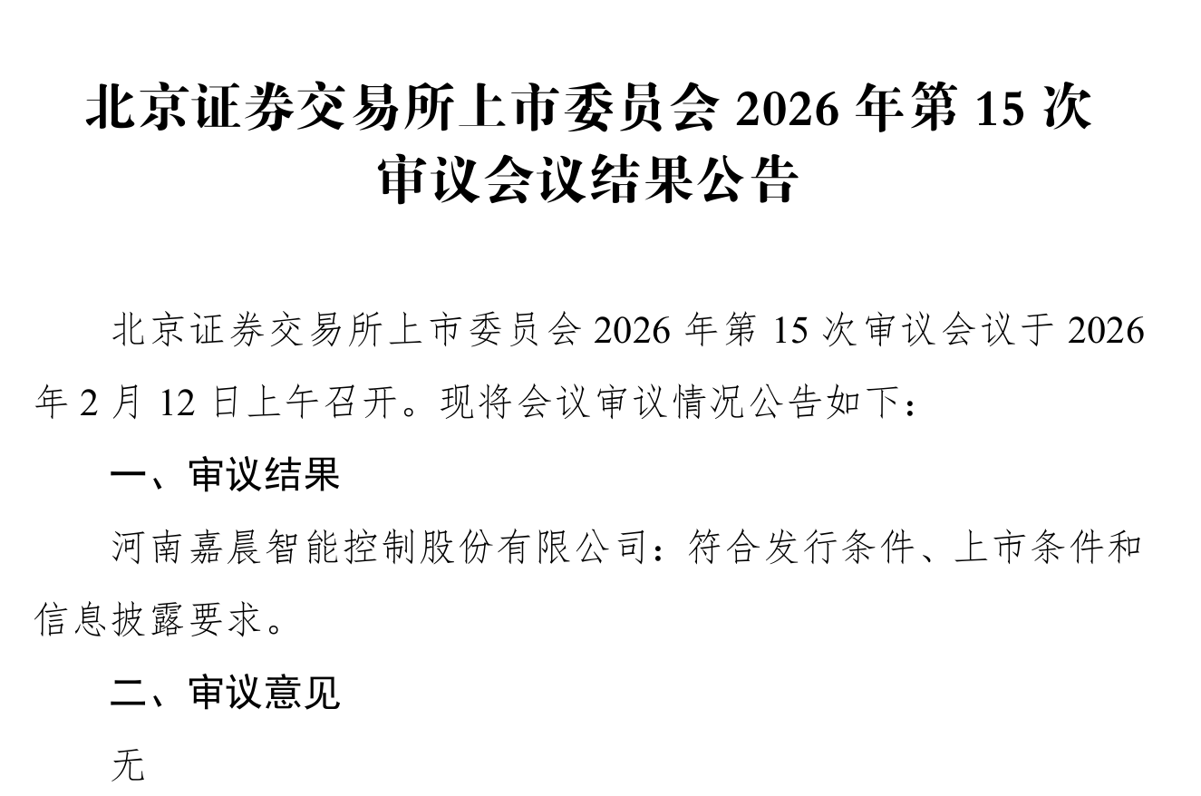 2月12日盤后,嘉晨智能發(fā)布北京證券交易所上市委員會2026年第15次審議會議結(jié)果公告。結(jié)果顯示,河南嘉晨智能控制股份有限公司(首發(fā))符合發(fā)行條件、上市條件和信息披露要求。