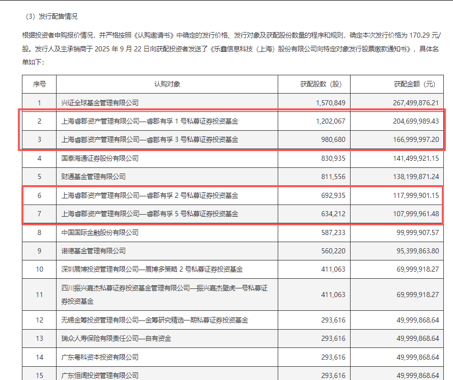 據(jù)樂(lè)鑫科技公告,在去年10月的定增項(xiàng)目中,董承非管理的睿郡有孚1號(hào)私募證券投資基金、睿郡有孚3號(hào)私募證券投資基金等4只產(chǎn)品,合計(jì)獲配351萬(wàn)股。