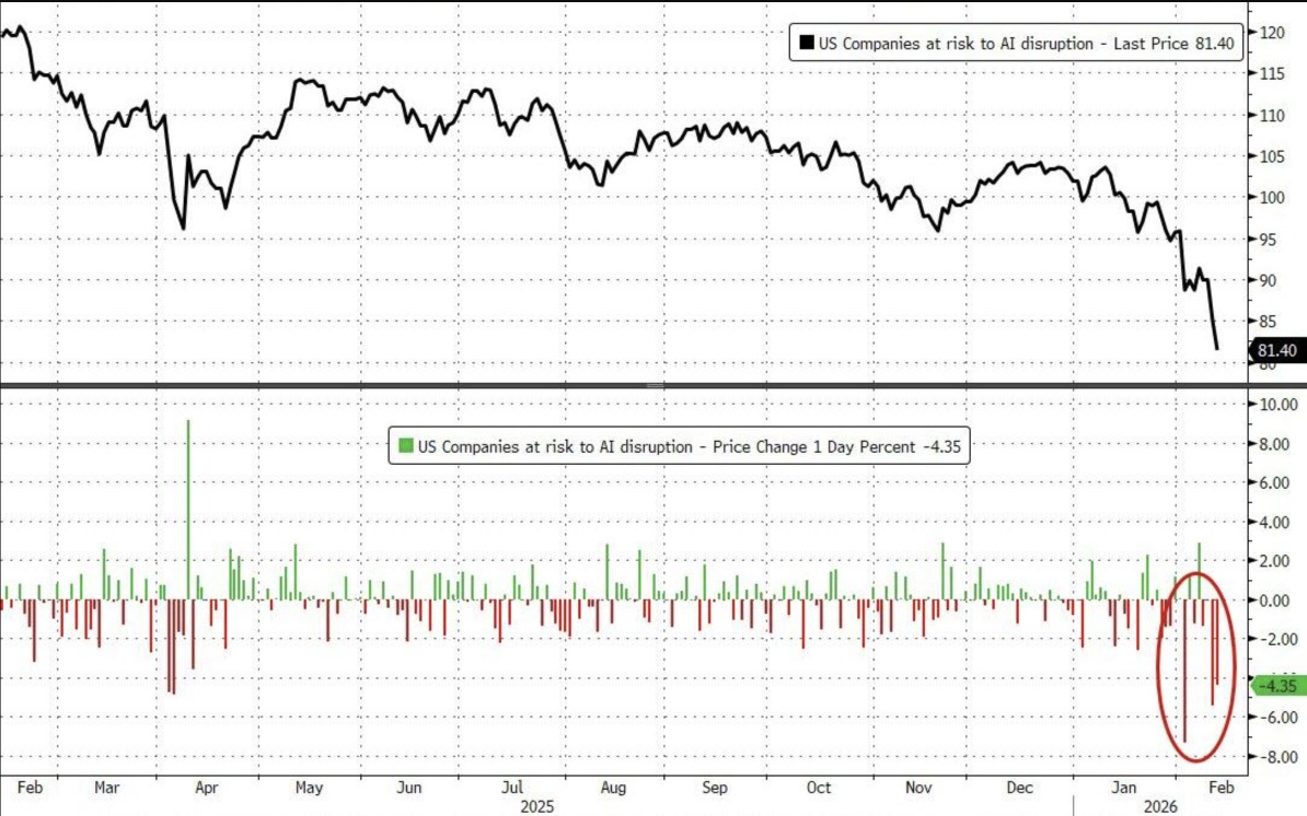 美股市場正經(jīng)歷一場罕見的全面性恐慌拋售,AI顛覆預期如同多米諾骨牌般沖擊各個行業(yè)板塊。