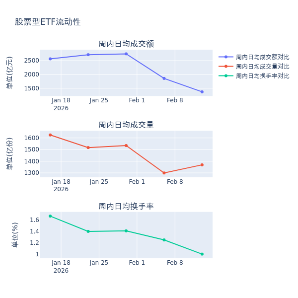 流動(dòng)性方面,節(jié)前一周股票型ETF市場(chǎng)日均成交額減少26.2%,日均成交量增加5.4%,換手率減少0.25%。