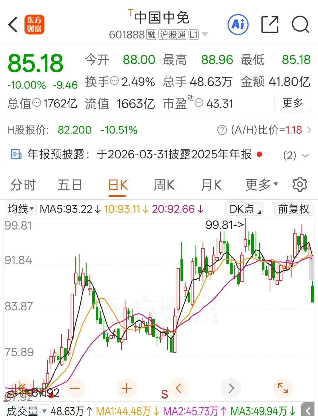 馬年首個交易日,在滬深股指表現(xiàn)出色的背景下,“免稅茅”中國中免低開低走,開盤后迅速封住跌停并維持到收盤,全天成交額為41.8億元,截至收盤封單金額約為7.61億元;港股方面,近三個交易日該公司跌幅亦超過22%。