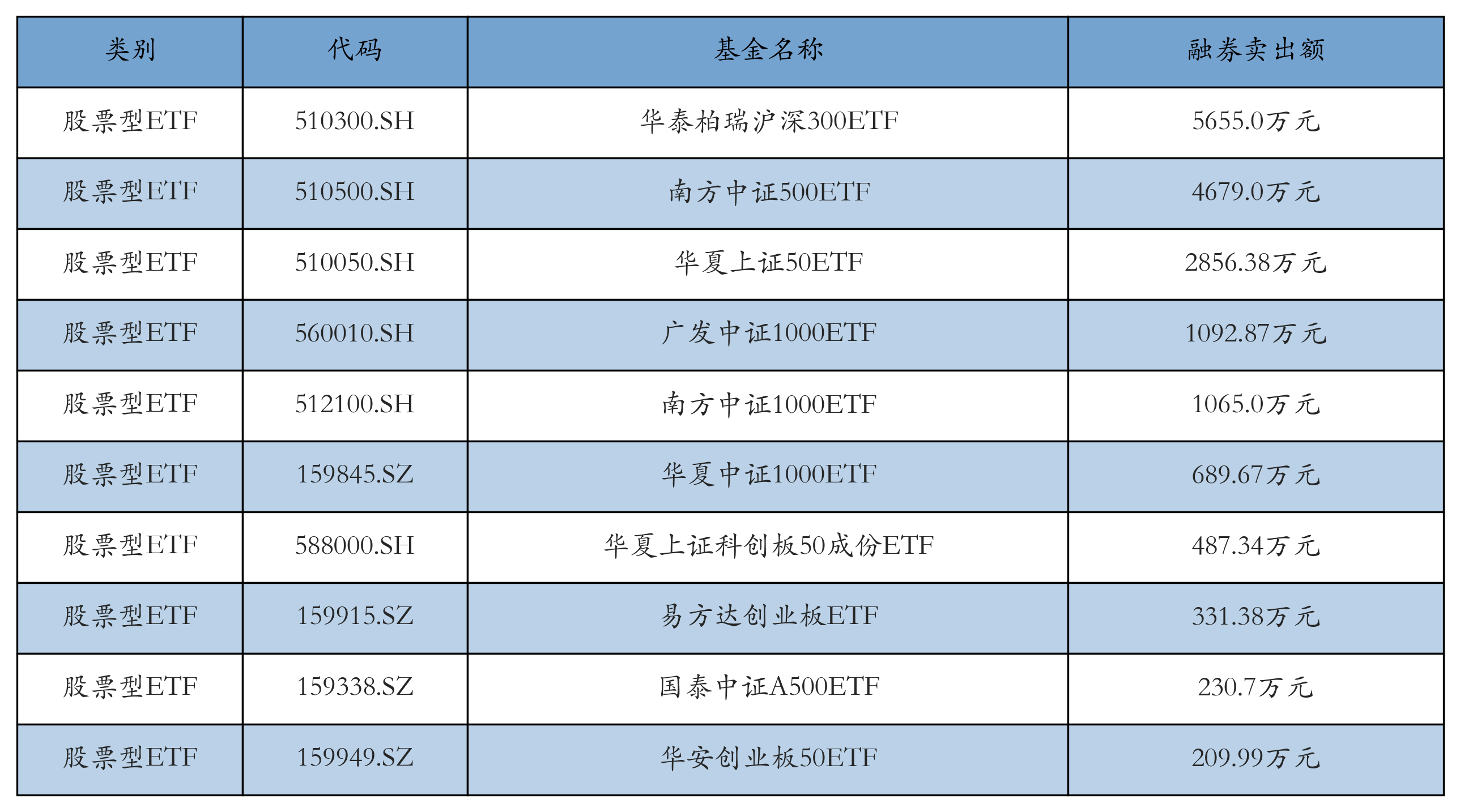 昨日股票型ETF融資賣(mài)出額最高的3只ETF及其賣(mài)出金額分別為:華泰柏瑞滬深300ETF(5655.0萬(wàn)元)、南方中證500ETF(4679.0萬(wàn)元)、華夏上證50ETF(2856.38萬(wàn)元)。融券賣(mài)出額前10詳情見(jiàn)下表: