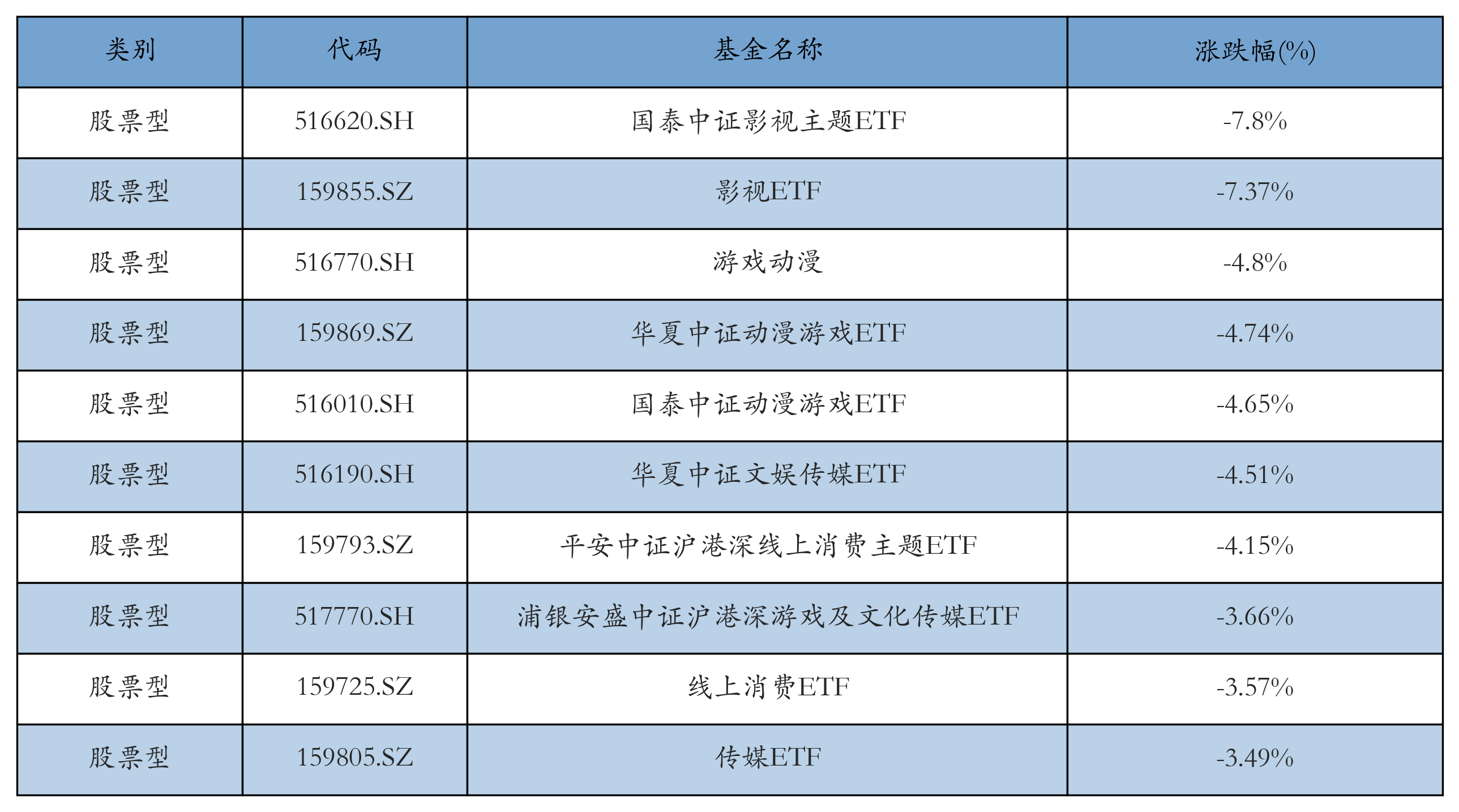 昨日股票型ETF跌幅最大的3只ETF及其收益率分別為:國(guó)泰中證影視主題ETF(-7.8%)、影視ETF(-7.37%)、游戲動(dòng)漫(-4.8%)。跌幅前10詳情見(jiàn)下表: