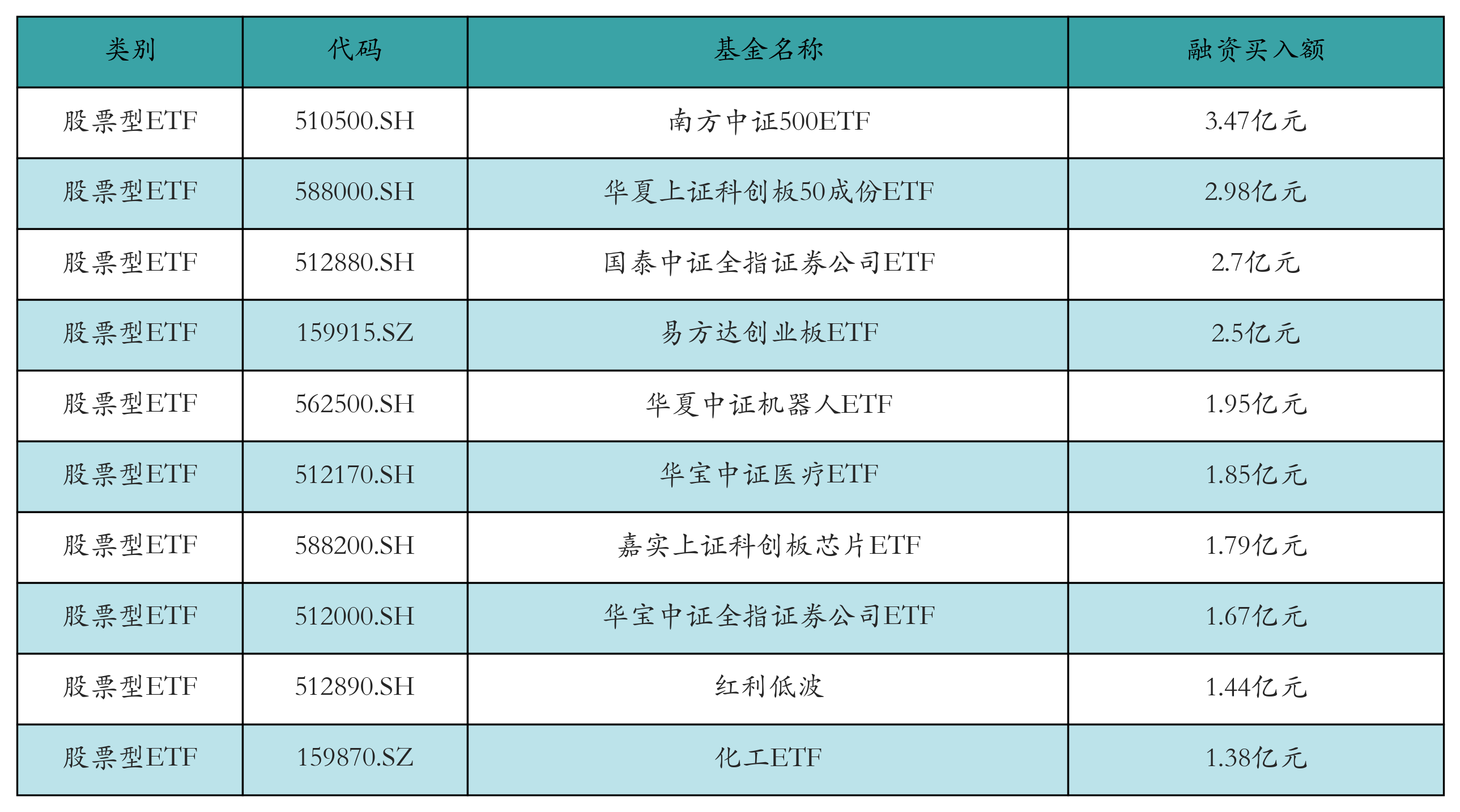 昨日股票型ETF融資買(mǎi)入額最高的3只ETF及其買(mǎi)入金額分別為:南方中證500ETF(3.47億元)、華夏上證科創(chuàng)板50成份ETF(2.98億元)、國(guó)泰中證全指證券公司ETF(2.7億元)。融資買(mǎi)入額前10詳情見(jiàn)下表: