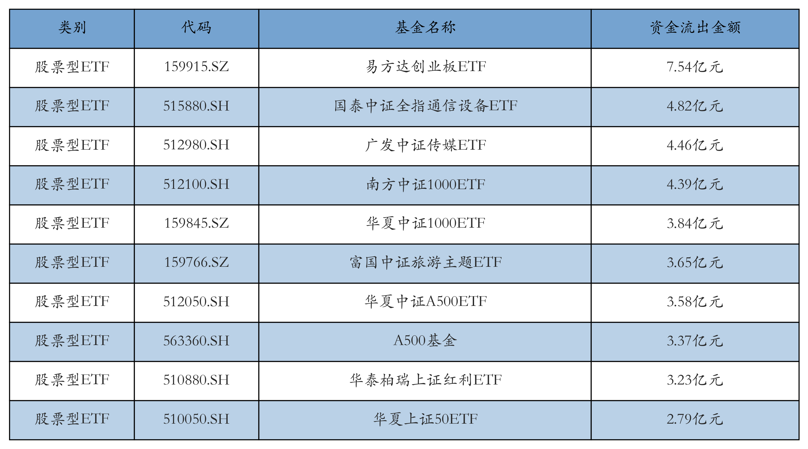 昨日股票型ETF資金流出最多的3只ETF及其流出金額分別為:易方達(dá)創(chuàng)業(yè)板ETF(流出7.54億元)、國(guó)泰中證全指通信設(shè)備ETF(流出4.82億元)、廣發(fā)中證傳媒ETF(流出4.46億元)。資金流出前10詳情見(jiàn)下表: