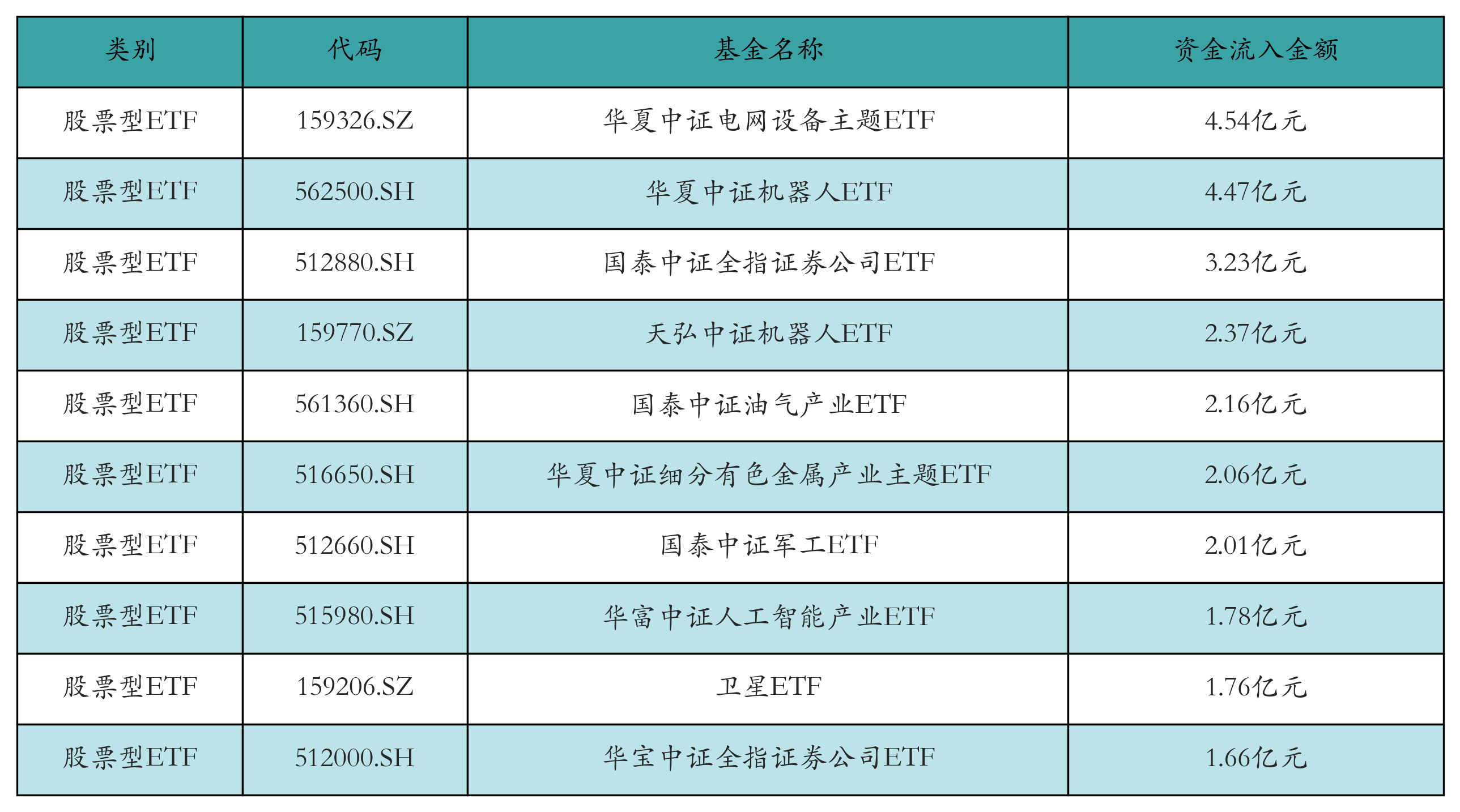 昨日股票型ETF資金流入最多的3只ETF及其流入金額分別為:華夏中證電網(wǎng)設(shè)備主題ETF(流入4.54億元)、華夏中證機(jī)器人ETF(流入4.47億元)、國(guó)泰中證全指證券公司ETF(流入3.23億元)。資金流入前10詳情見(jiàn)下表: