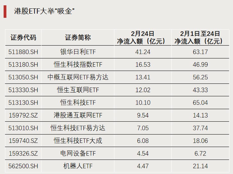 前一交易日(2月24日),ETF全市場單日獲資金凈流入額超過110億元。這也是近6個交易日以來,單日資金凈流入額最高的一天。主投港股市場的ETF吸金勢頭較強。單日資金凈流入額前十的ETF中,港股ETF占比過半。