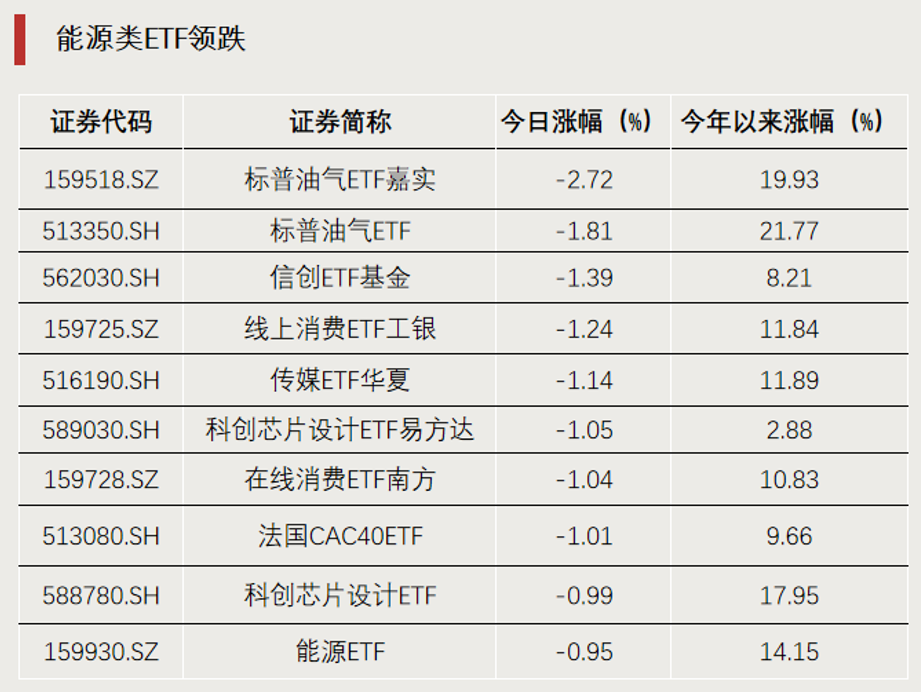 與此同時,能源類ETF出現(xiàn)一定回調(diào)。2只標(biāo)普油氣ETF跌幅居全市場前兩位,而這兩只基金昨日均漲超9%。此外,部分主投傳媒板塊的ETF跌幅也較為靠前。
