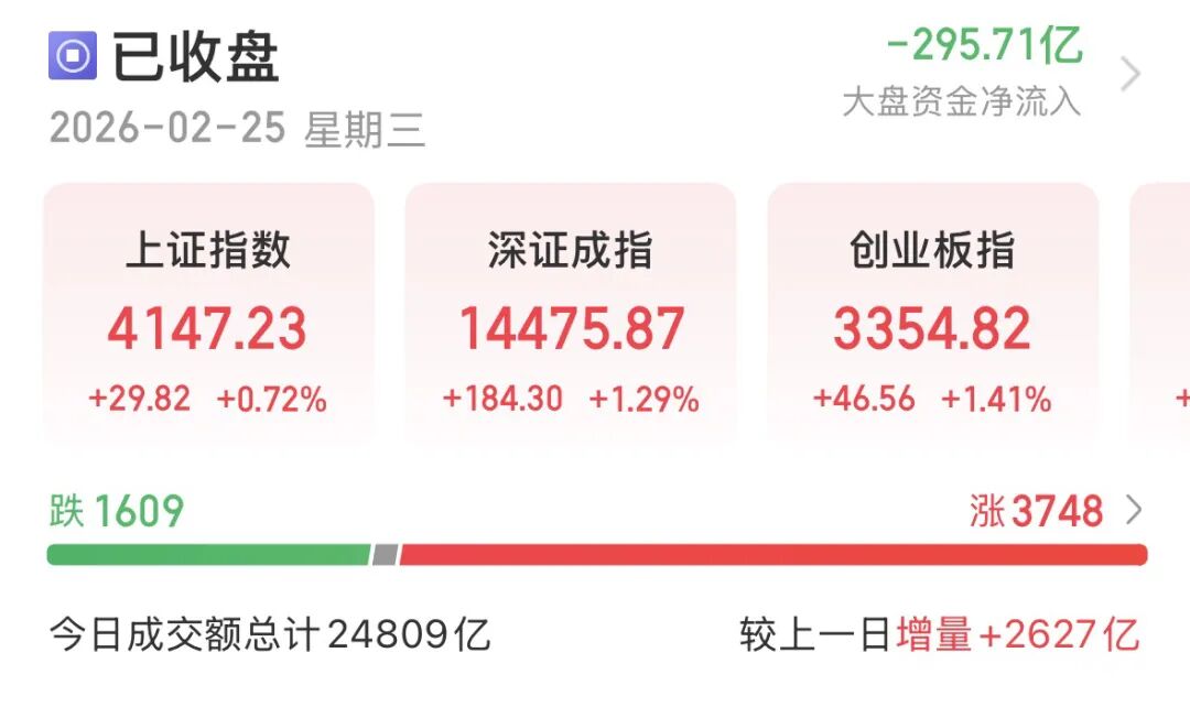 今日A股延續(xù)春節(jié)紅包行情,早盤(pán)一路高走,午后出現(xiàn)回落,尾盤(pán)略有拉升。指數(shù)表現(xiàn)方面,滬指收漲0.72%報(bào)4147.23點(diǎn),創(chuàng)業(yè)板指收漲1.41%報(bào)3354.82點(diǎn),深證成指收漲1.29%??苿?chuàng)50、北證50、上證50、滬深300均收紅,但漲幅均不超過(guò)1%。