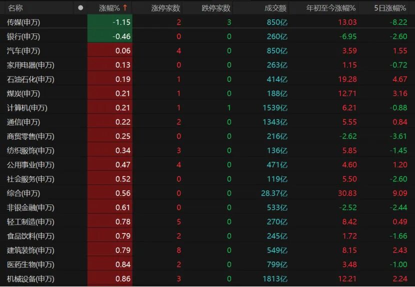 31個(gè)申萬(wàn)一級(jí)行業(yè)中,傳媒、銀行收跌,其余飄紅。汽車(chē)、家用電器、石油石化、煤炭等板塊均微紅。