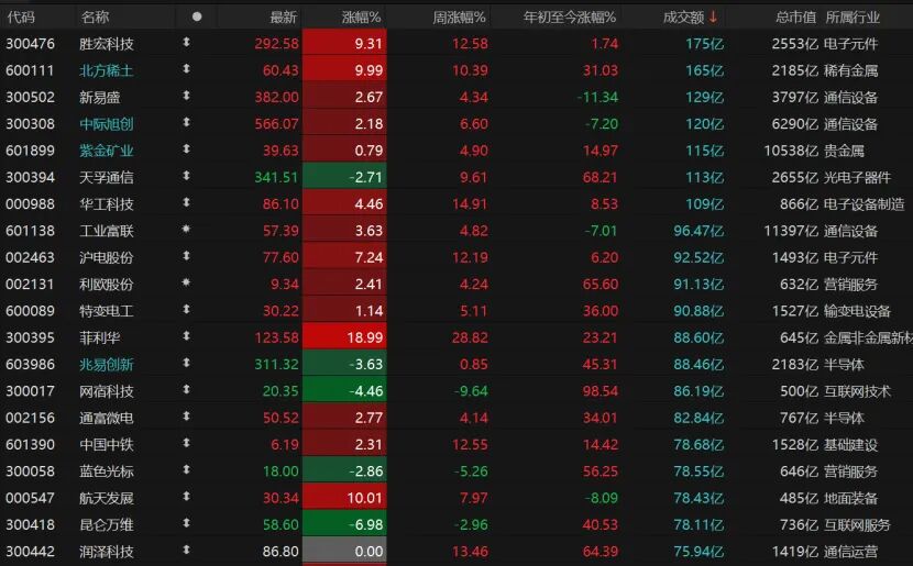 市場(chǎng)賺錢(qián)效應(yīng)良好,3748只個(gè)股收漲,漲停股101只;1609只個(gè)股收跌,跌停股4只。從活躍交易個(gè)股來(lái)看,7只個(gè)股日成交額超過(guò)100億元,電子元件、稀有金屬等板塊個(gè)股表現(xiàn)強(qiáng)勢(shì),勝宏科技、北方稀土、滬電股份等漲幅居前。