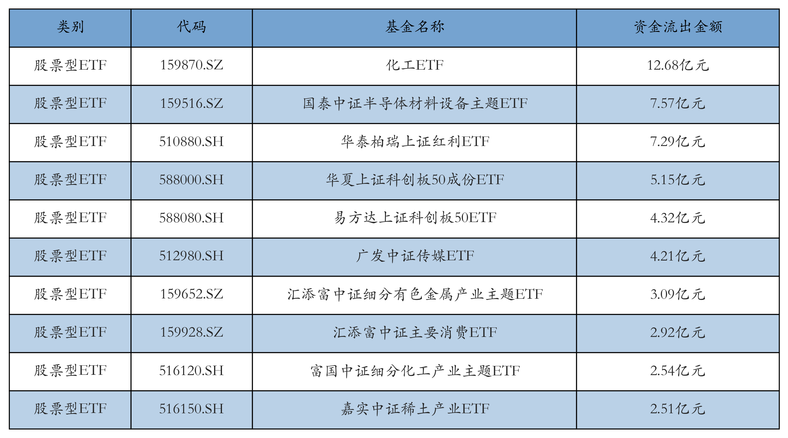 昨日股票型ETF資金流出最多的3只ETF及其流出金額分別為:化工ETF(流出12.68億元)、國泰中證半導(dǎo)體材料設(shè)備主題ETF(流出7.57億元)、華泰柏瑞上證紅利ETF(流出7.29億元)。資金流出前10詳情見下表: