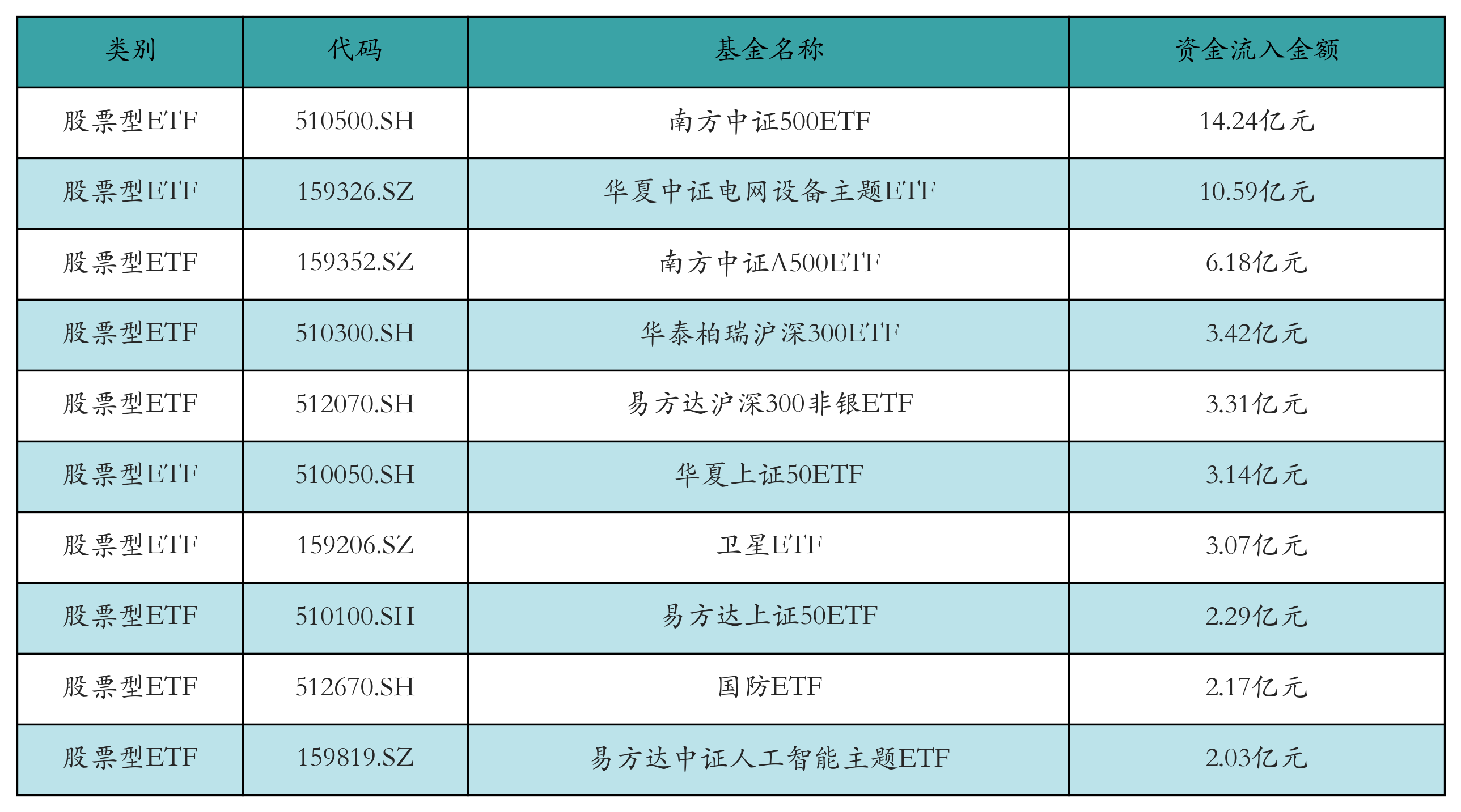 昨日股票型ETF資金流入最多的3只ETF及其流入金額分別為:南方中證500ETF(流入14.24億元)、華夏中證電網(wǎng)設(shè)備主題ETF(流入10.59億元)、南方中證A500ETF(流入6.18億元)。資金流入前10詳情見下表: