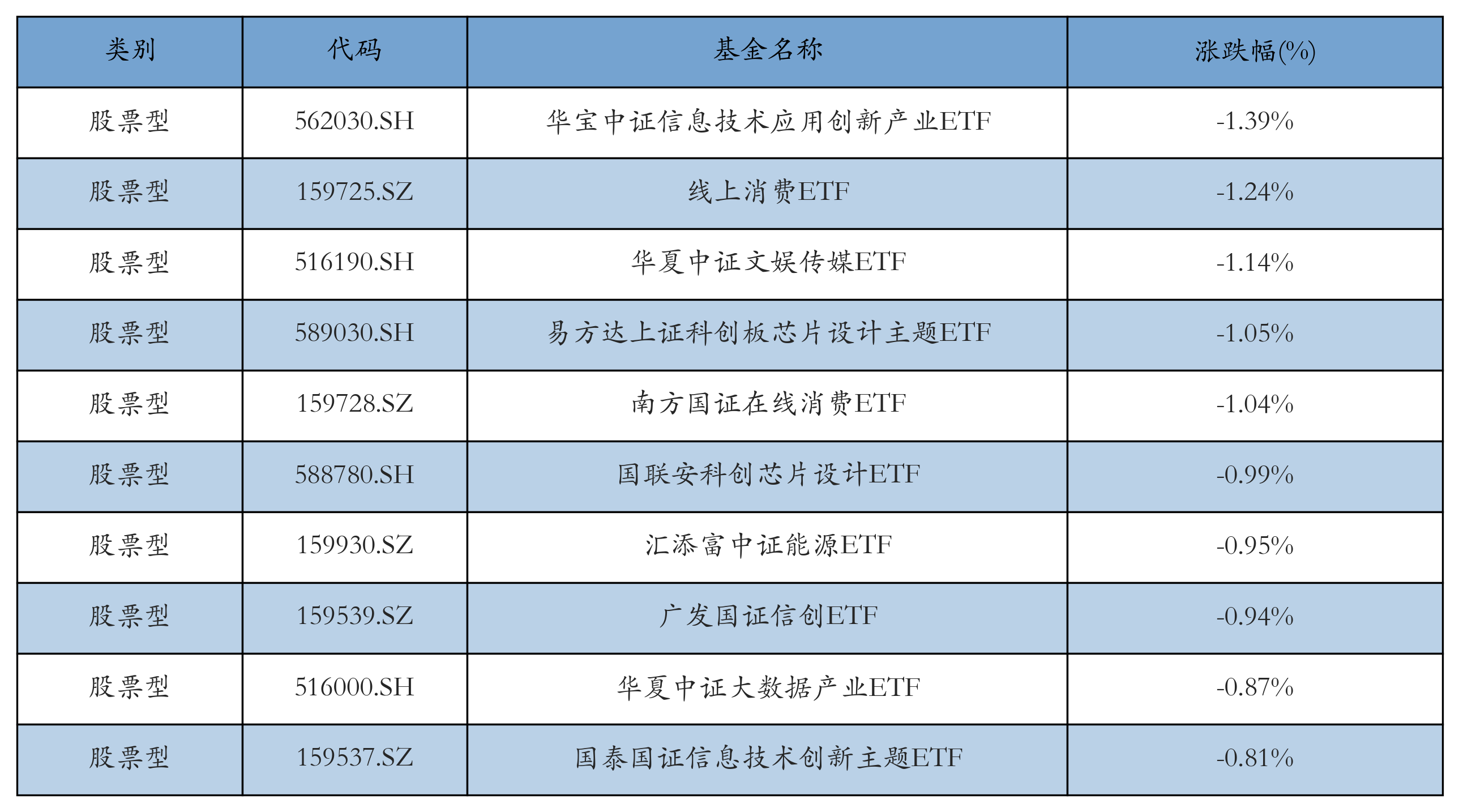 昨日股票型ETF跌幅最大的3只ETF及其收益率分別為:華寶中證信息技術(shù)應(yīng)用創(chuàng)新產(chǎn)業(yè)ETF(-1.39%)、線上消費(fèi)ETF(-1.24%)、華夏中證文娛傳媒ETF(-1.14%)。跌幅前10詳情見下表: