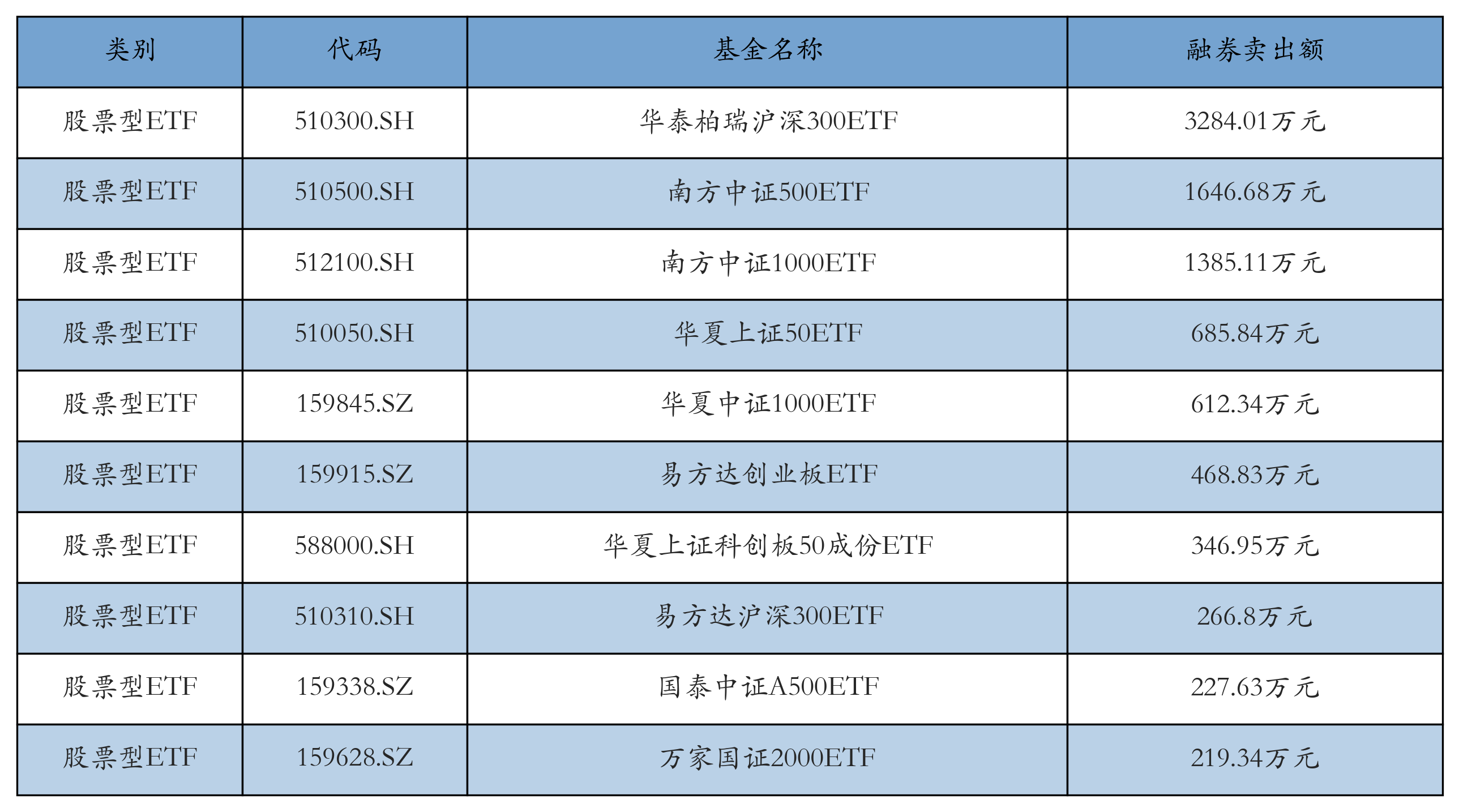 昨日股票型ETF融資賣出額最高的3只ETF及其賣出金額分別為:華泰柏瑞滬深300ETF(3284.01萬元)、南方中證500ETF(1646.68萬元)、南方中證1000ETF(1385.11萬元)。融券賣出額前10詳情見下表: