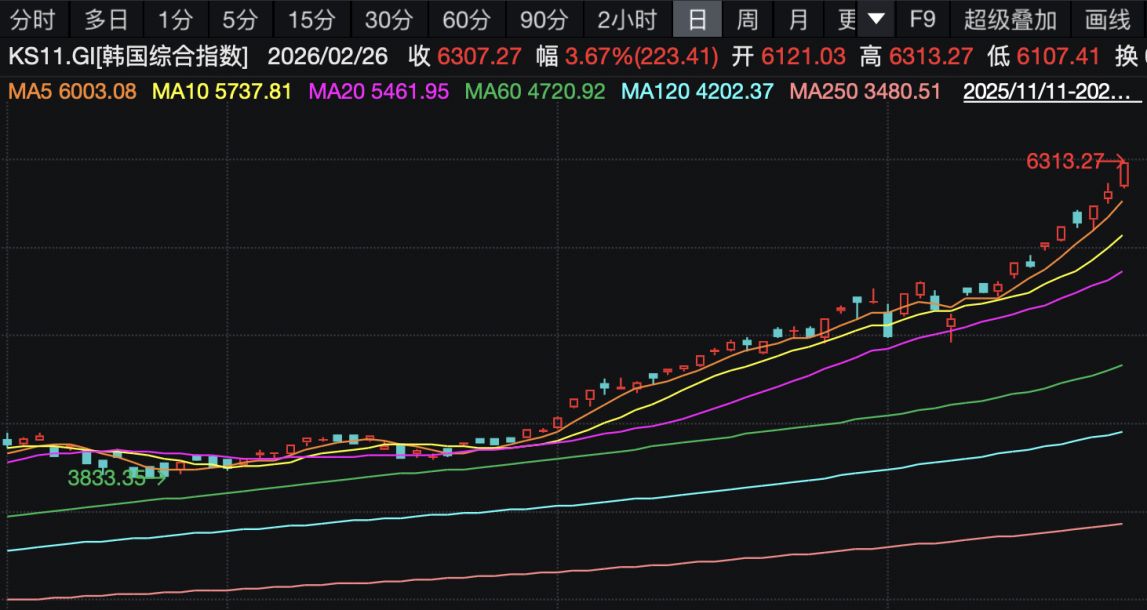 以韓國為例,繼2025年累計(jì)上漲75.63%牛冠全球后,今年韓國股市繼續(xù)大漲。年初以來,韓國綜合股價(jià)指數(shù)(KOSPI)已經(jīng)上漲49.67%;就在今天盤中,該指數(shù)還一度創(chuàng)下6313.27點(diǎn)的歷史新高。