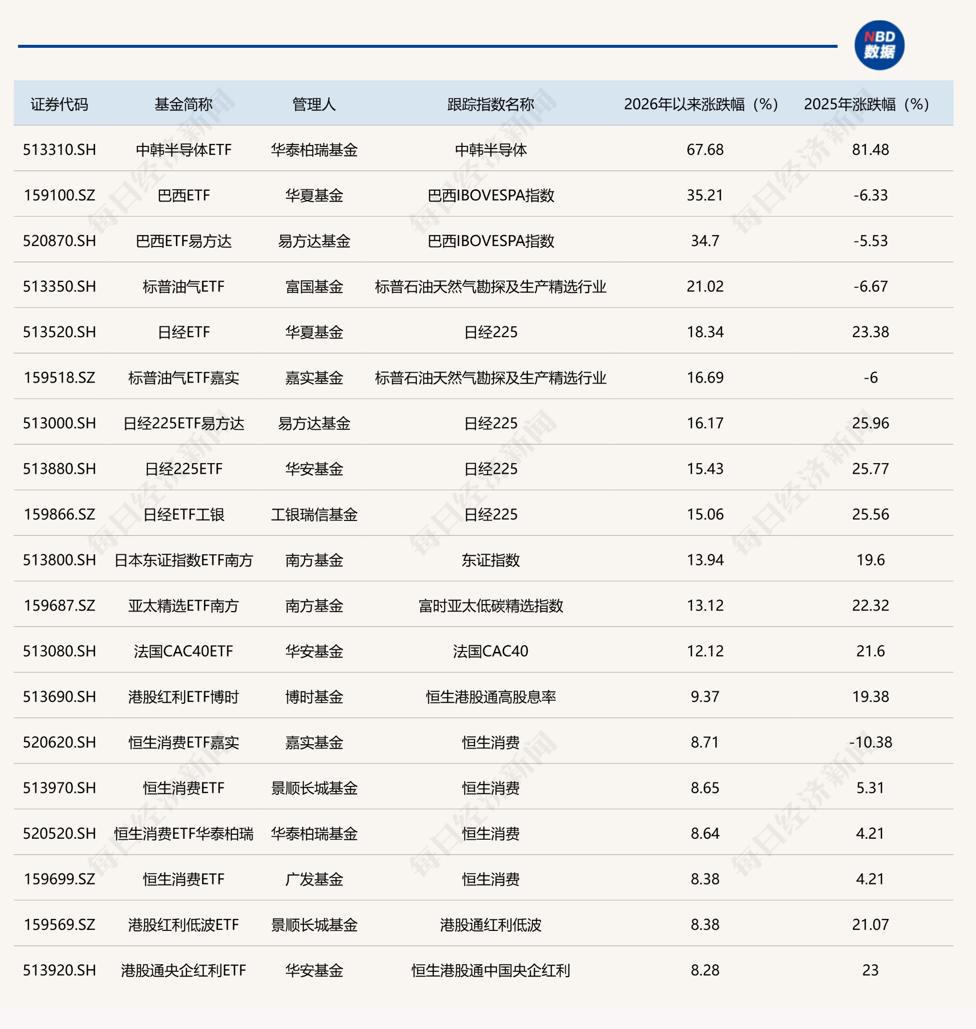 《每日經(jīng)濟(jì)新聞》記者獲悉,近日包括韓國、巴西、日本、法國等國的股市接連出現(xiàn)大漲,國內(nèi)公募基金中投資于這些市場的跨境ETF也隨之快速走強(qiáng)。