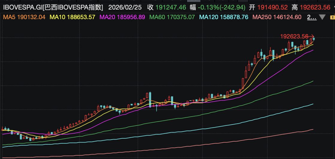 再來看看巴西市場。繼2025年大漲33.95%之后,巴西IBOVESPA指數(shù)今年繼續(xù)走強(qiáng),截至2月25日年內(nèi)漲幅已達(dá)18.69%。