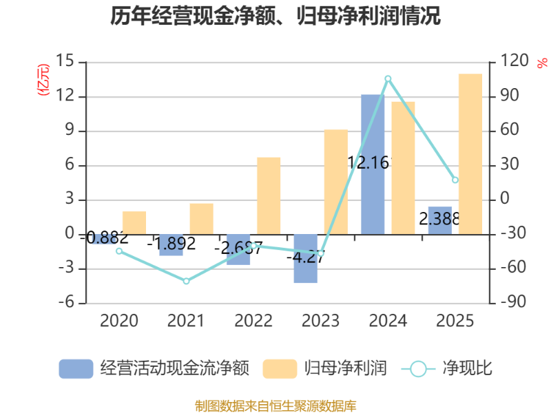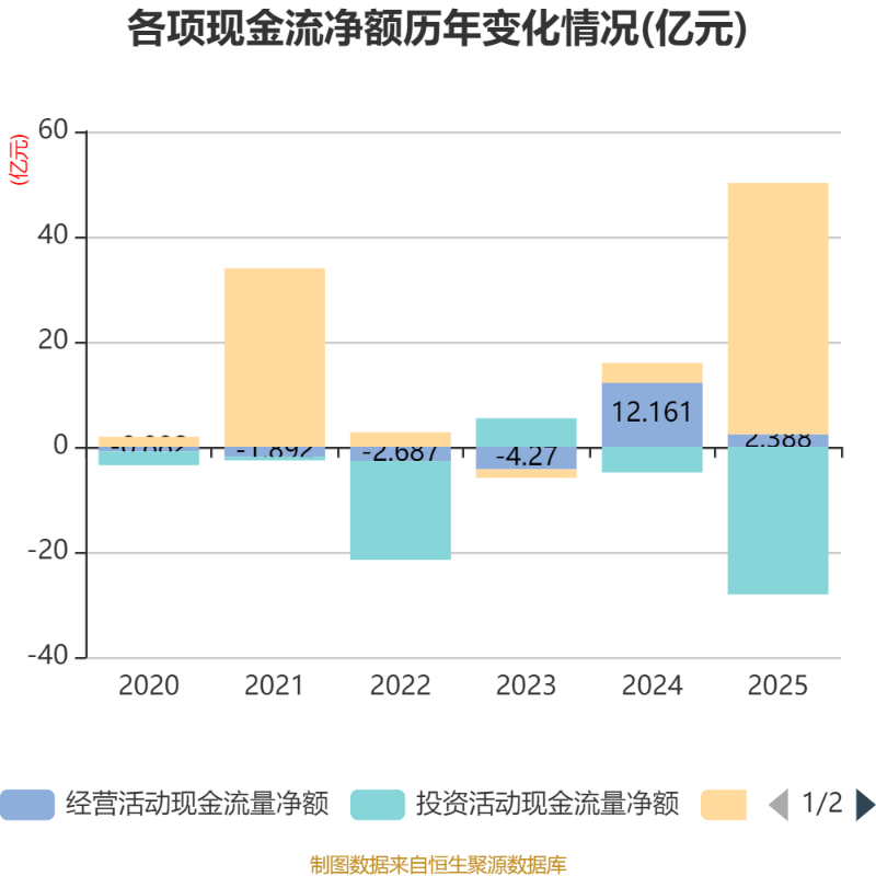截至2025年,公司經(jīng)營(yíng)活動(dòng)現(xiàn)金流凈額為2.39億元,同比下降80.36%;籌資活動(dòng)現(xiàn)金流凈額47.78億元,同比增加44億元;投資活動(dòng)現(xiàn)金流凈額-28.1億元,上年同期為-4.9億元。