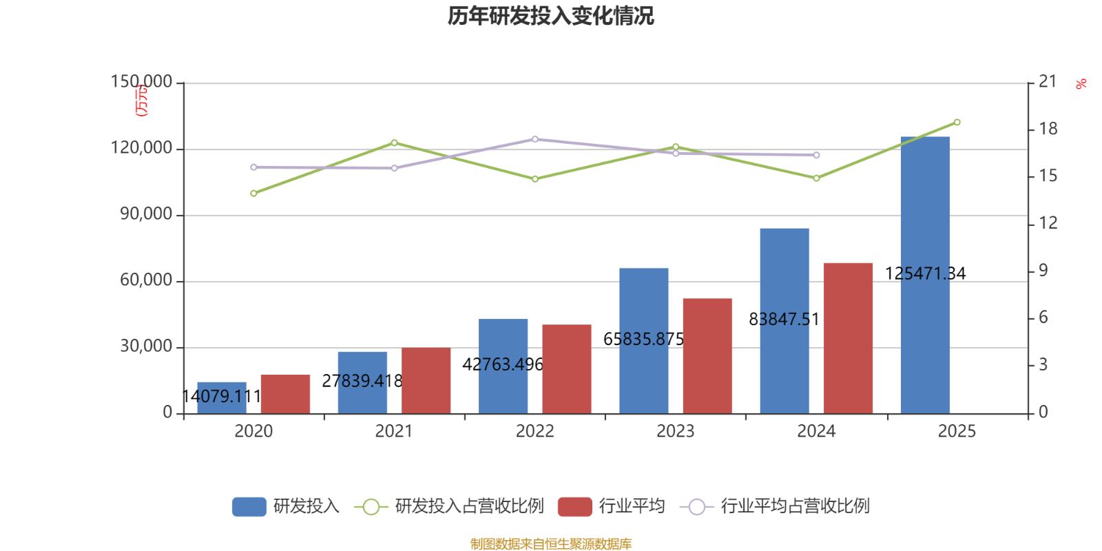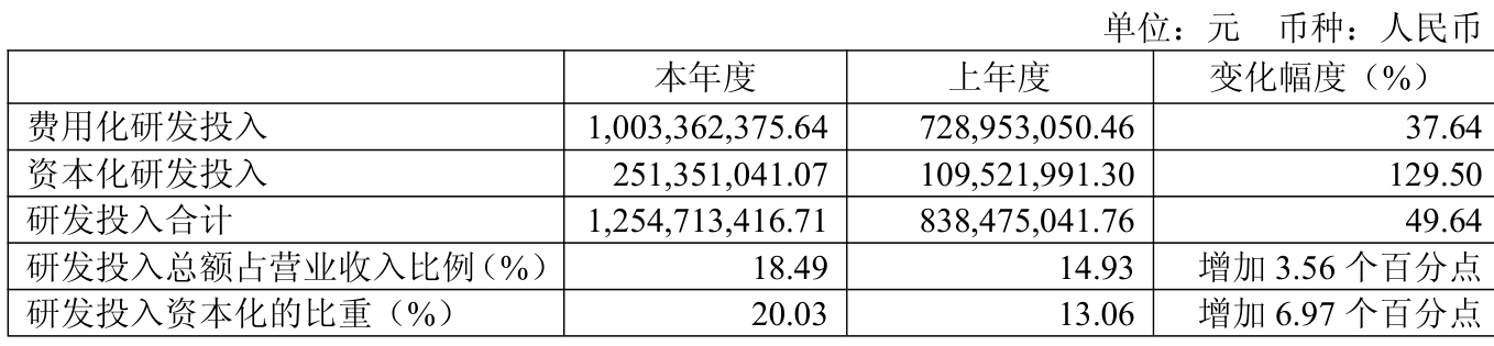 2025年全年,公司研發(fā)投入金額為12.55億元,同比增長(zhǎng)49.64%;研發(fā)投入占營(yíng)業(yè)收入比例為18.49%,相比上年同期上升3.56個(gè)百分點(diǎn)。此外,公司全年研發(fā)投入資本化率為20.03%。