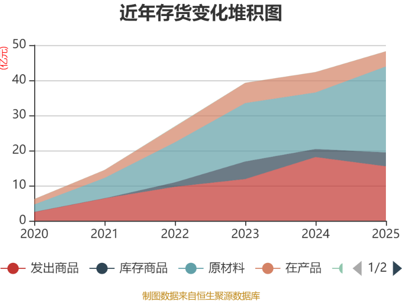 從存貨變動(dòng)來(lái)看,截至2025年末,公司存貨賬面價(jià)值為48.22億元,占凈資產(chǎn)的35.8%,較上年末增加5.9億元。其中,存貨跌價(jià)準(zhǔn)備為1.44億元,計(jì)提比例為2.89%。