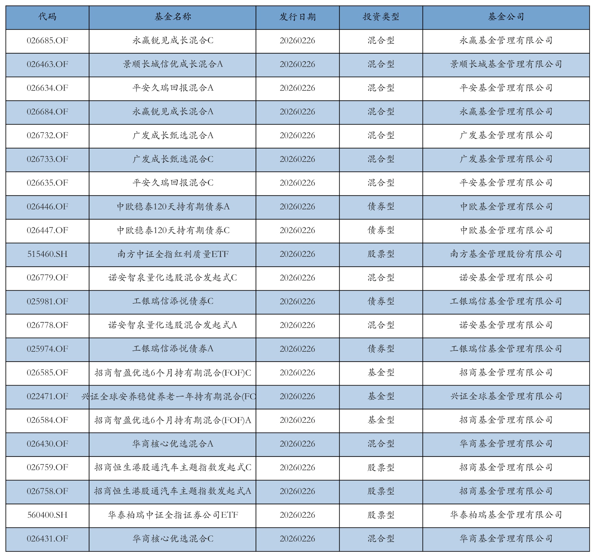 昨日有22只新基金發(fā)行,分別為:永贏銳見成長混合C、景順長城信優(yōu)成長混合A、平安久瑞回報(bào)混合A、永贏銳見成長混合A、廣發(fā)成長甄選混合A、廣發(fā)成長甄選混合C、平安久瑞回報(bào)混合C、中歐穩(wěn)泰120天持有期債券A、中歐穩(wěn)泰120天持有期債券C、南方中證全指紅利質(zhì)量ETF、諾安智泉量化選股混合發(fā)起式C、工銀瑞信添悅債券C、諾安智泉量化選股混合發(fā)起式A、工銀瑞信添悅債券A、招商智盈優(yōu)選6個(gè)月持有期混合(FOF)C、興證全球安養(yǎng)穩(wěn)健養(yǎng)老一年持有期混合(FOF)、招商智盈優(yōu)選6個(gè)月持有期混合(FOF)A、華商核心優(yōu)選混合A、招商恒生港股通汽車主題指數(shù)發(fā)起式C、招商恒生港股通汽車主題指數(shù)發(fā)起式A、華泰柏瑞中證全指證券公司ETF、華商核心優(yōu)選混合C,詳情見下表: