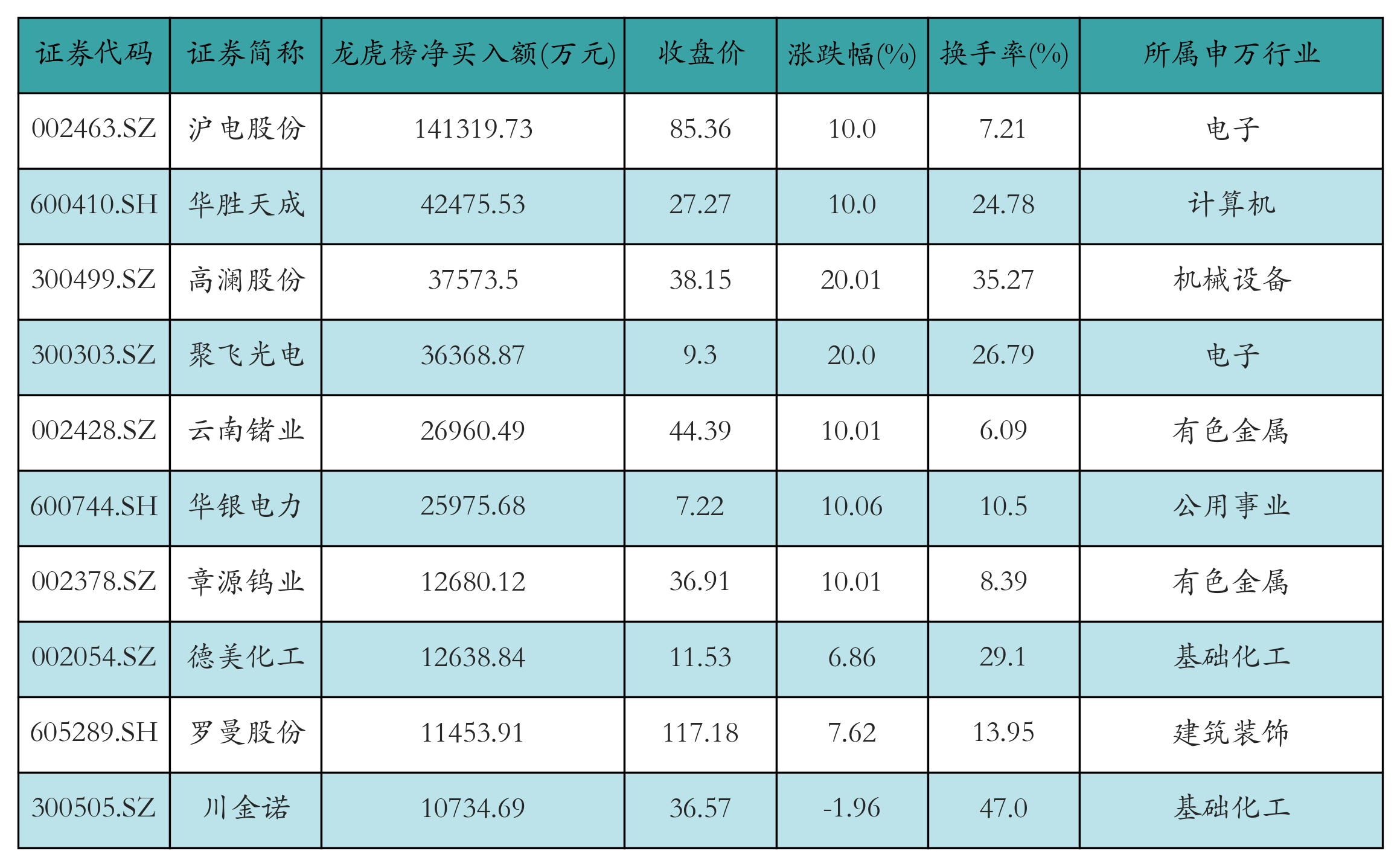 兩市共有3484只個(gè)股有融資資金買入,其中勝宏科技、寒武紀(jì)、中際旭創(chuàng)排名前三,買入金額分別36.08億元、26.06億元、21.14億元。融資買入額前10個(gè)股詳情見下表:
