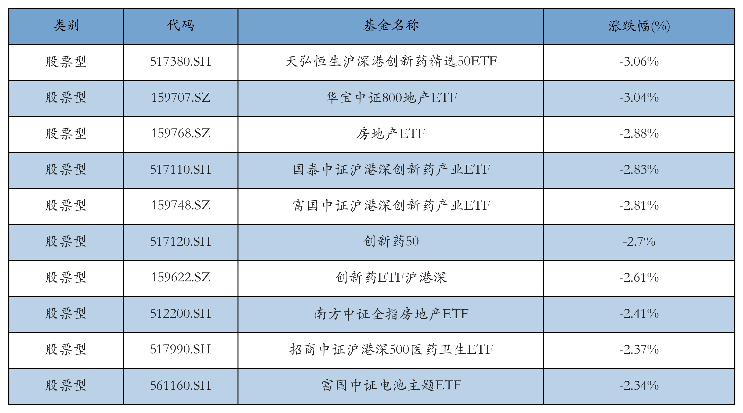 昨日股票型ETF跌幅最大的3只ETF及其收益率分別為:天弘恒生滬深港創(chuàng)新藥精選50ETF(-3.06%)、華寶中證800地產(chǎn)ETF(-3.04%)、房地產(chǎn)ETF(-2.88%)。跌幅前10詳情見下表: