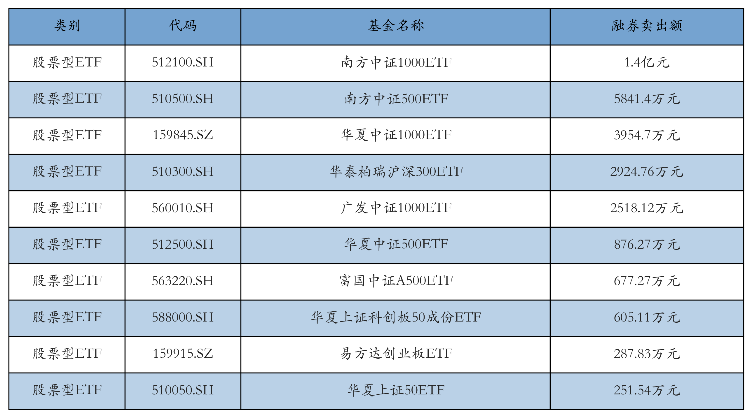 昨日股票型ETF融資賣出額最高的3只ETF及其賣出金額分別為:南方中證1000ETF(1.4億元)、南方中證500ETF(5841.4萬元)、華夏中證1000ETF(3954.7萬元)。融券賣出額前10詳情見下表: