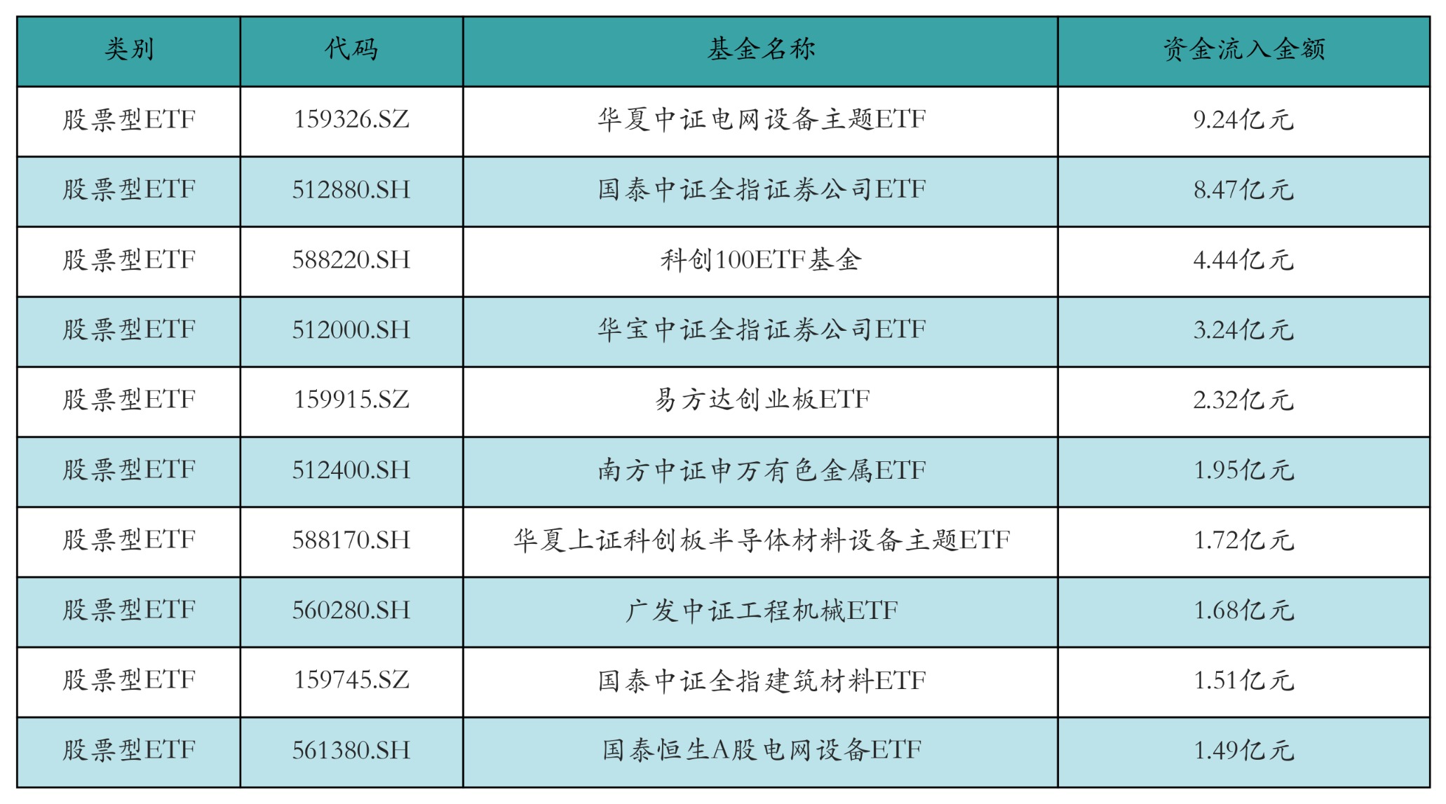 昨日股票型ETF資金流入最多的3只ETF及其流入金額分別為:華夏中證電網(wǎng)設備主題ETF(流入9.24億元)、國泰中證全指證券公司ETF(流入8.47億元)、科創(chuàng)100ETF基金(流入4.44億元)。資金流入前10詳情見下表: