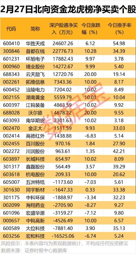 凈買(mǎi)入金額最多的是華勝天成,達(dá)2.46億元;其次是首都在線、環(huán)旭電子、錫業(yè)股份,凈買(mǎi)入金額分別為2.28億元、1.79億元、1.43億元。