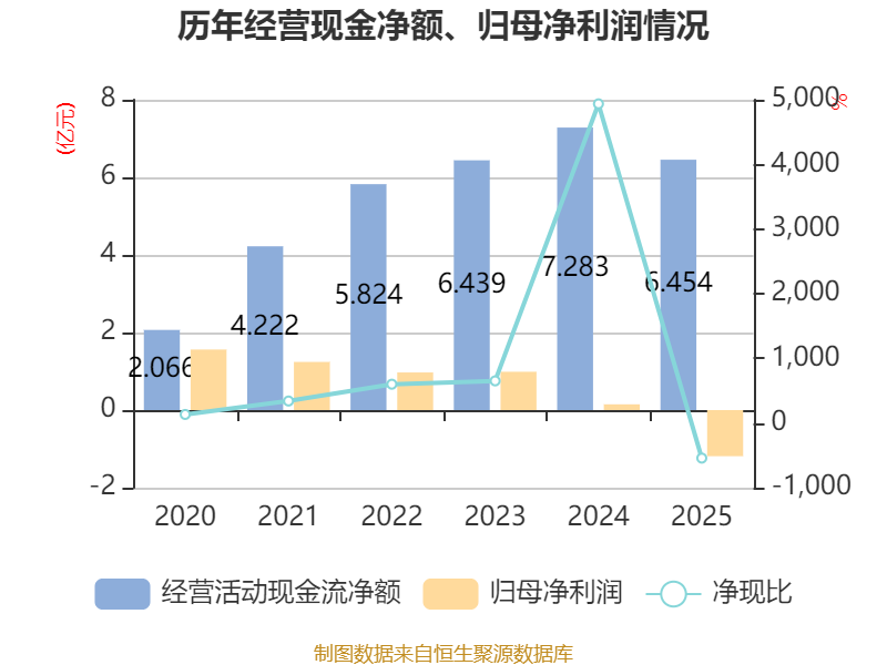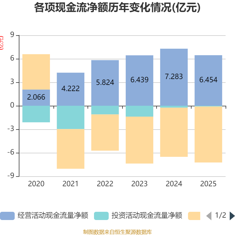 截至2025年,公司經(jīng)營活動現(xiàn)金流凈額為6.45億元,同比下降11.38%;籌資活動現(xiàn)金流凈額-7.15億元,同比減少8729.94萬元;投資活動現(xiàn)金流凈額-950.87萬元,上年同期為-2464.44萬元。