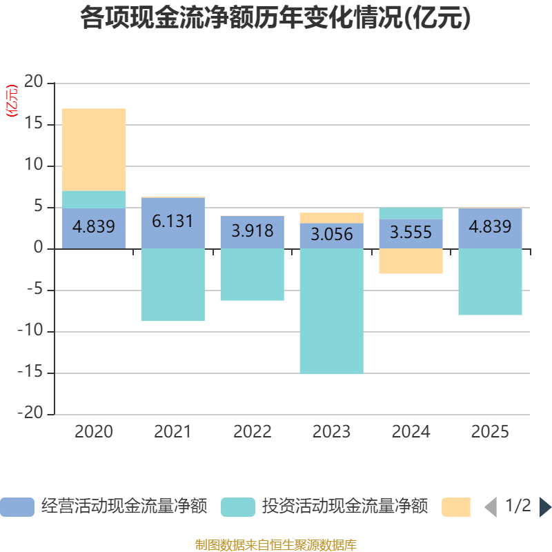 截至2025年,公司經(jīng)營(yíng)活動(dòng)現(xiàn)金流凈額為4.84億元,同比增長(zhǎng)36.13%;籌資活動(dòng)現(xiàn)金流凈額688.78萬(wàn)元,同比增加3.12億元;投資活動(dòng)現(xiàn)金流凈額-8.04億元,上年同期為1.37億元。
