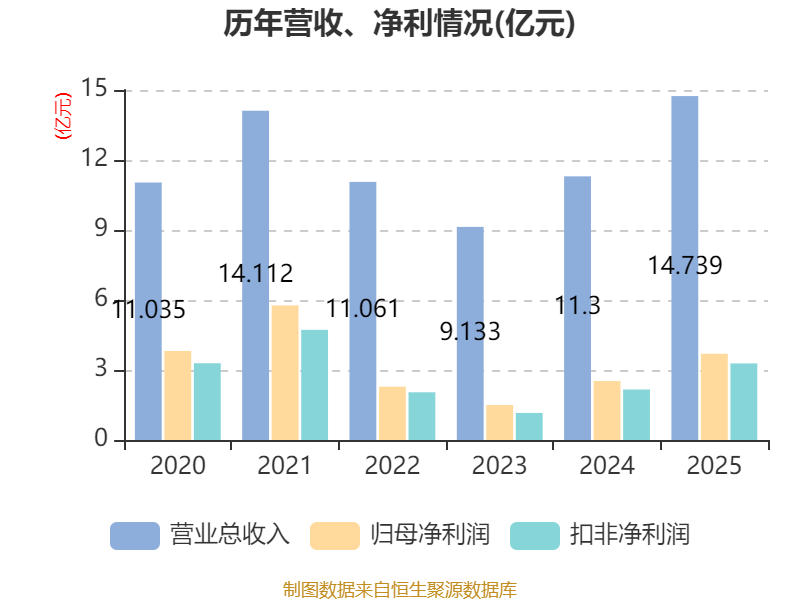 2025年全年,公司研發(fā)投入金額為1.53億元,同比下降4.01%;研發(fā)投入占營(yíng)業(yè)收入比例為10.39%,相比上年同期下降3.73個(gè)百分點(diǎn)。此外,公司全年研發(fā)投入資本化率為0%。