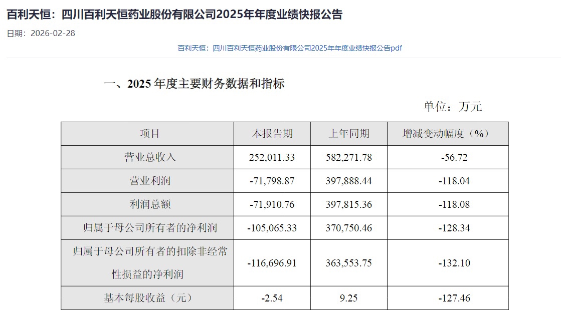 根據(jù)百利天恒發(fā)布的2025年業(yè)績快報(bào)來看,公司全年實(shí)現(xiàn)營業(yè)總收入252011.33萬元,同比減少56.72%;實(shí)現(xiàn)歸屬于母公司所有者的凈利潤為虧損105065.33萬元,同比減少128.34%;歸屬于母公司所有者的扣除非經(jīng)常性損益的凈利潤為虧損116696.91萬元,同比減少132.1%。