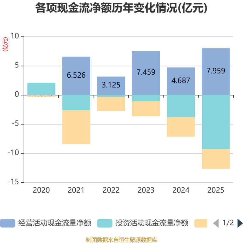 截至2025年,公司經(jīng)營活動現(xiàn)金流凈額為7.96億元,同比增長69.81%;籌資活動現(xiàn)金流凈額-3.35億元,同比減少338.55萬元;投資活動現(xiàn)金流凈額-9.34億元,上年同期為-3.86億元。