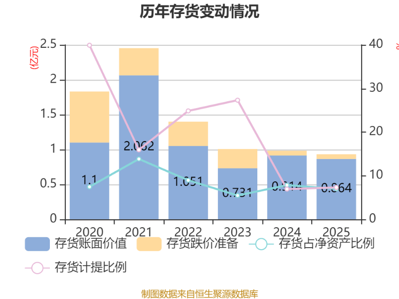從存貨變動來看,截至2025年末,公司存貨賬面價值為8643.04萬元,占凈資產(chǎn)的6.98%,較上年末減少495.94萬元。其中,存貨跌價準備為680.17萬元,計提比例為7.3%。