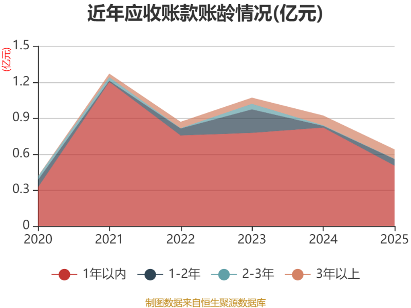 從應收賬款賬齡結(jié)構(gòu)來看,截至2025年末,公司賬齡在1年以內(nèi)的應收賬款余額為0.5億元,較上年末下降3180.69萬元,占應收賬款總額比例為78.72%,較上年末下降10.29個百分點。